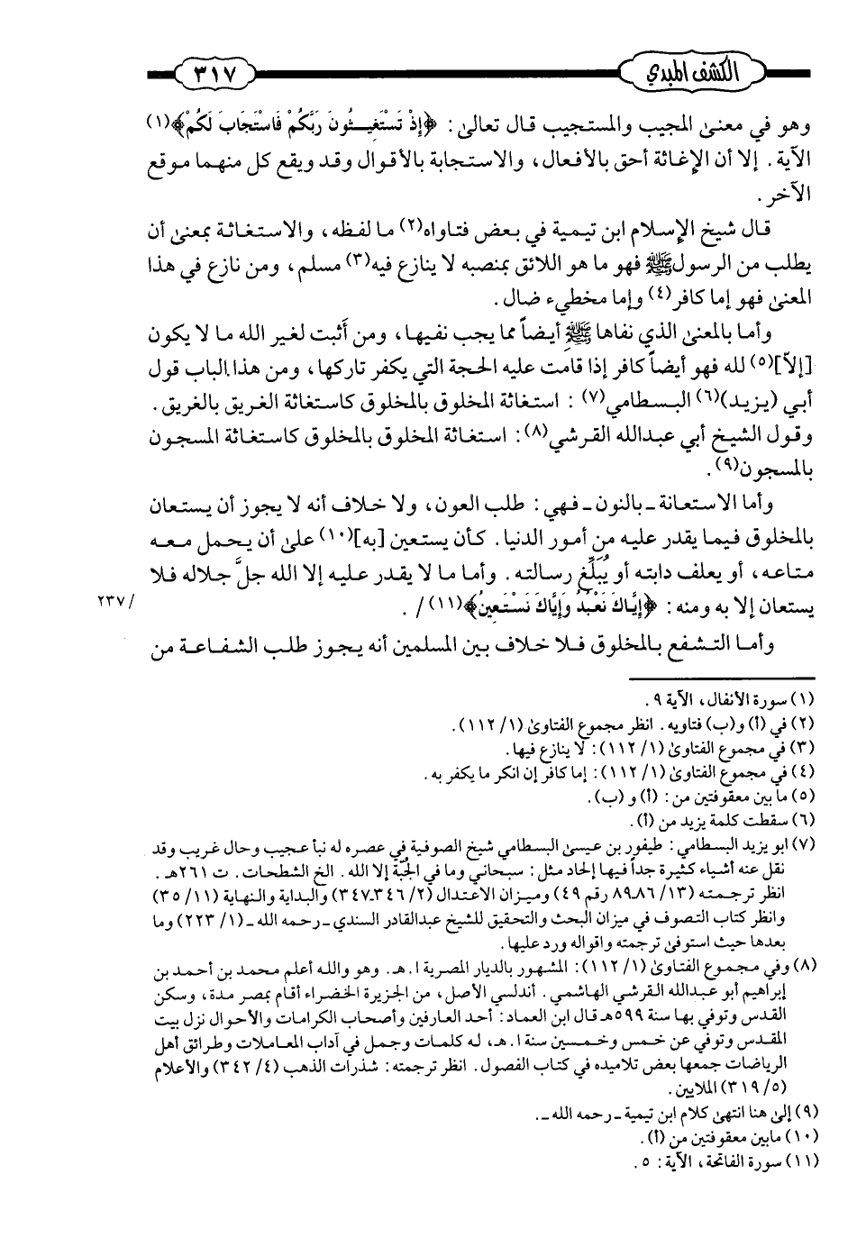 ومن هذا الباب: قول أبي يزيد البسطاميّ: استغاثة المخلوق بالمخلوق كاستغاثة الغريق بالغريق، وقول الشّيخ أبي عبد الله القرشيّ: استغاثة المخلوق بالمخلوق كاستغاثة المسجون بالمسجون.