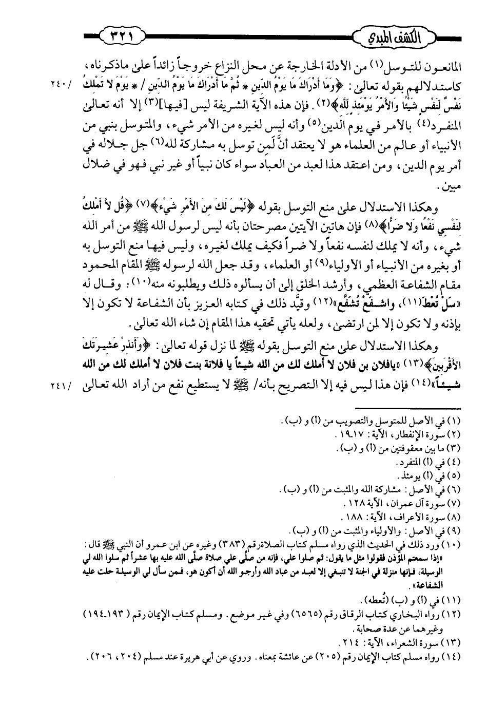 وهكذا الاستدلال على منع التّوسّل بقوله صلى الله عليه وسلم، لما نزل قوله ـ تعالى ـ: {وأنذر عشيرتك الأقربين} : «يا فلان بن فلان؛ لا أملك لك من الله شيئًا، يا فلانة بنت فلان؛ لا أملك لكِ من الله شيئًا» ؛ فإنّ هذا ليس فيه إلَّا التّصريح بأنّه صلى الله عليه وسلم لا يستطيع نفع مَن أراد الله ـ تعالى ـ