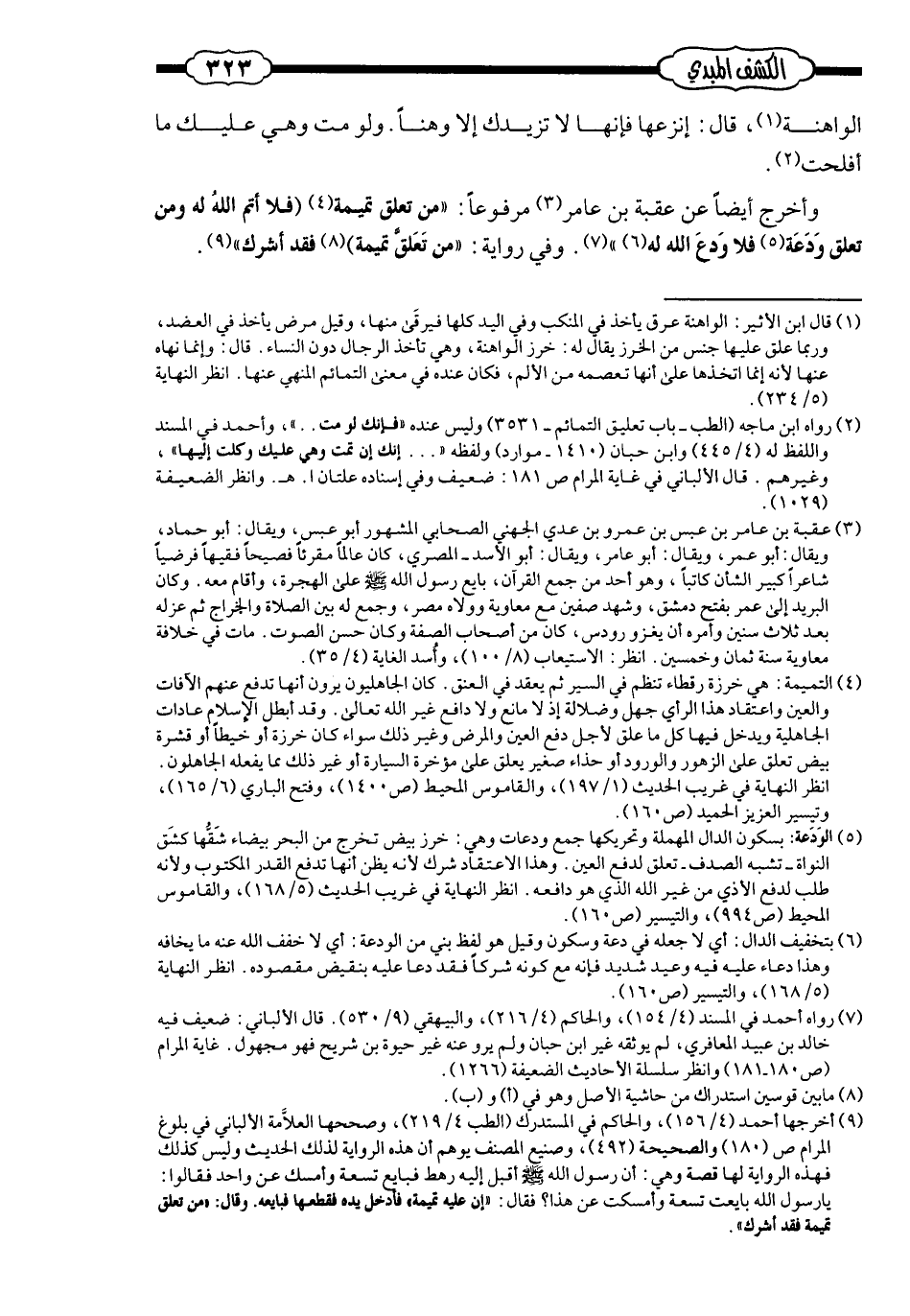 وأخرج أيضًا، عن عقبة بن عامر مرفوعًا: «مَن تعلّق تميمة فلا أتمّ الله له، ومَن تعلّق ودعة فلا ودع له» ، وفي رواية: «مَن تعلّق تميمة فقد أشرك» .