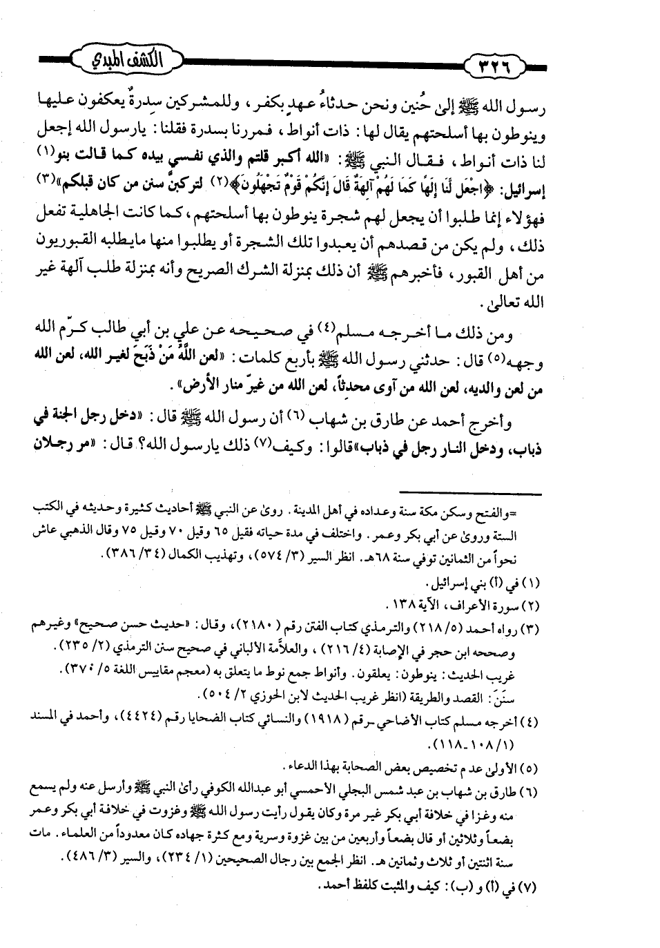 رسول الله صلى الله عليه وسلم إلى حنين، ونحن حدثاء عهد بكفر، وللمشركين سدرة يعكفون عليها وينوطون بها أسلحتهم، يُقال لها: ذات أنواط؛ فمررنا بسدرة؛ فقلنا: يا رسول الله؛ اجعل لنا ذات أنواط! فقال النّبيّ صلى الله عليه وسلم: «الله أكبر! قلتم ـ والذي نفسي بيده ـ كما قالت بنو إسرائيل: {اجعل لنا إلهًا كما لهم آلهة قال إنّكم قوم تجهلون} ؛ لتركبنّ سنن مَن كان قبلكم» .