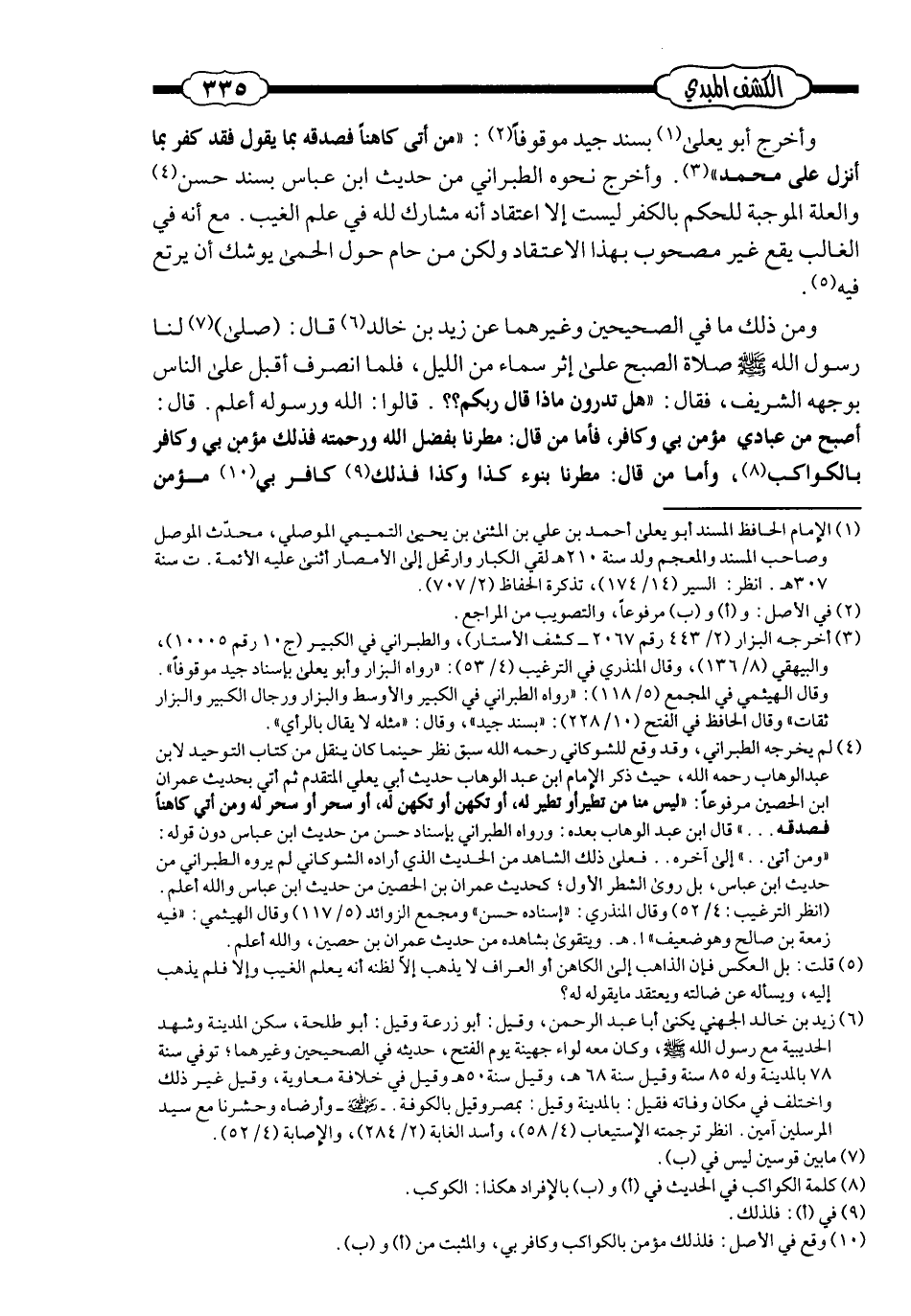 وأخرج أبو يعلى ـ بسند جيّد ـ، موقوفًا: «مَن أتى كاهنًا فصدّقه بما يقول؛ فقد كفر بما أُنزل على محمّد» ، وأخرج نحوه الطّبرانيّ من حديث ابن عبّاس، بسند حسن.