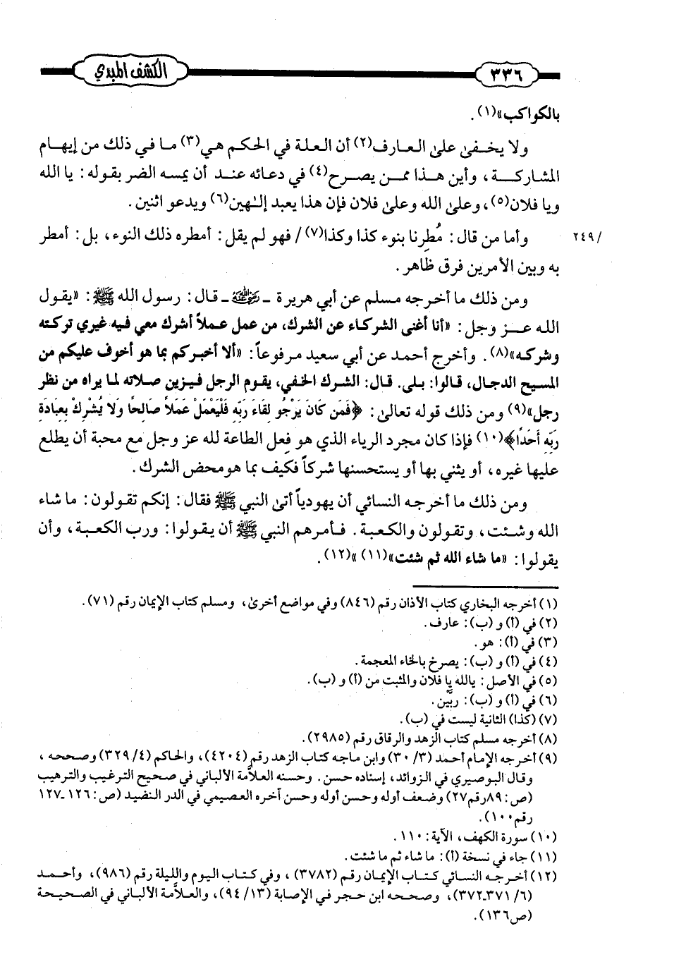 ولا يخفى على العارف أنّ العلة في الحكم بالكفر هي: ما في ذلك من إيهام المشاركة، وأين هذا ممّن يصرّح في دعائه عندما يمسّه الضّرّ بقوله: يا الله ويا فلان، و: على الله وعلى فلان؛ فإنّ هذا يعبد إلهين ويدعو اثنين!