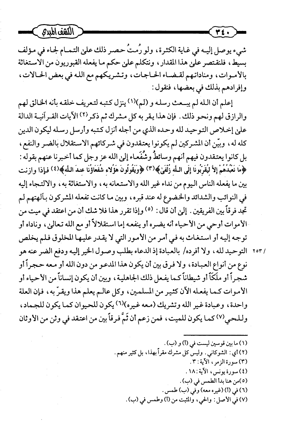 إلى أن قال: وإذا تقرّر هذا؛ فلا شكّ أنّ مَن اعتقد في ميّت من الأموات أوحيّ من الأحياء أنّه يضرّه أو ينفعه ـ إمّا استقلالًا أو مع الله (تعالى) ـ، وناداه أو توجّه إليه أو استغاث به في أمر من الأمور التي لا يقدر عليها المخلوق؛ فلم يخص التّوحيد لله، ولا أفرده بالعبادة؛