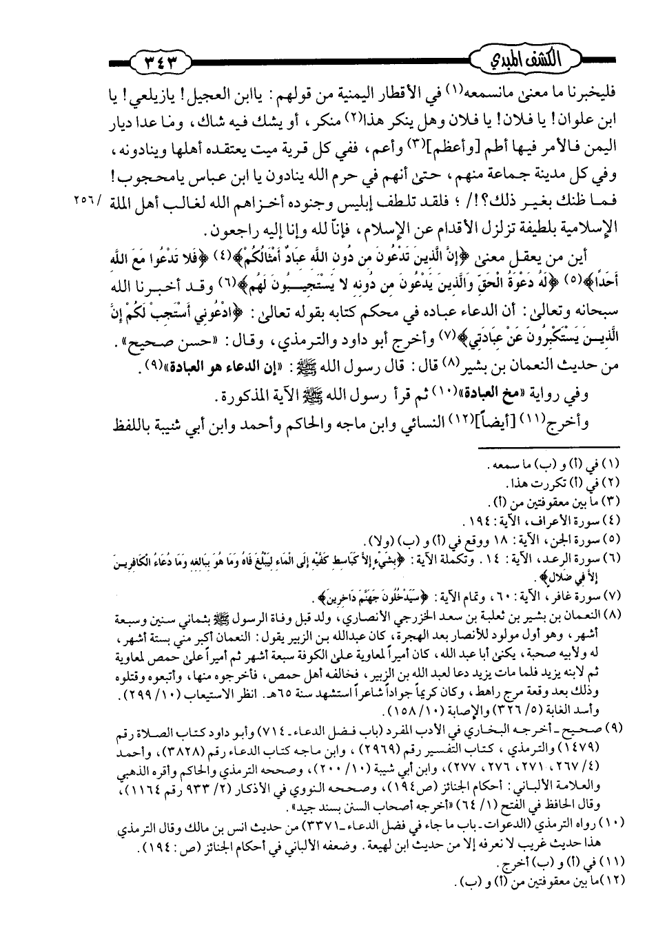 فليخبرنا: ما معنى ما نسمعه في الأقطار اليمنية من قولهم: يا ابن العجيل! يا زيلعي! يا ابن علوان! يا فلان! يا فلان! وهل ينكر هذا منكر، أو يشكّ فيه شاكّ؟! وما عدا ديار اليمن؛ فالأمر فيها أطمّ [وأعظم] وأعمّ! ففي كل قرية ميّت يعتقده أهلها وينادونه، وفي كل مدينة جماعة منهم، حتى أنّهم في حرم الله ينادون: يا ابن عبّاس! يا محجوب! فما ظنّك بغير ذلك؟! فلقد تلطّف إبليس وجنوده ـ أخزاهم الله ـ لغالب أهل الملّة الإسلاميّة بلطفية تزلزل الأقدام عن الإسلام؛ فإنّا لله وإنّا إليه راجعون.