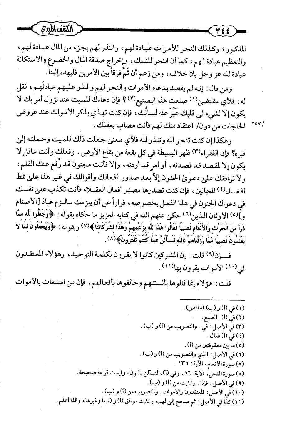 وهكذا إن كنتَ تنحر لله؛ فلأيّ معنى جعلتَ ذلك للميّت، وحملتَه إلى قبره؟! فإنّ الفقراء على ظهر البسيطة في كلّ بقعة من بقاع الأرض! وفعلك وأنتَ عاقل لا يكون إلَّا لمقصد قد قصدتَه، أو أمر قد أردتَه؛ وإلا فأنتَ مجنون قد رُفِعَ عنك القلم! ولا نوافقك على دعوى الجنون إلَّا بعد صدور أفعالك وأقوالك في غير هذا على نمط أفعال المجانين؛ فإن كنتَ تصدرها مصدر أفعال العقلاء؛ فأنتَ تكذب على نفسك في دعواك الجنون في هذا الفعل بخصوصه؛ فرارًا عن أن يلزمك ما لزم عبّاد [الأصنام و] الأوثان الذين حكى عنهم الله في كتابه العزيز ما حكاه بقوله: {وجعلوا لله مما ذرأ من الحرث والأنعام نصيبًا فقالوا هذا لله بزعمهم وهذا لشركائنا} ، وبقوله: {ويجعلون لما لا يعلمون نصيبًا ممّا رزقناهم تالله لتسألنّ عمّا كنتم تفترون} .