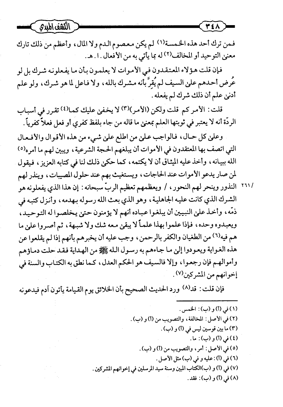 وعلى كل حال؛ فالواجب على من اطّلع على شيء من هذه الأقوال والأفعال التي اتّصف بها المعتقدون في الأموات: أن يبلّغهم الحُجّة الشّرعيّة، ويبيّن لهم ما أمره الله بيانه، وأخذ عليه الميثاق أن لا يكتمه؛ كما حكى ذلك لنا في كتابه العزيز؛ فيقول لمَن صار يدعو الأموات عند الحاجات، ويستغيث بهم عند حلول المصيبات، وينذر لهم النّذور، وينحر لهم النّحور، ويعظّمهم تعظيم الرّبّ ـ سبحانه ـ: إنّ هذا الذي يفعلونه هو الشّرك الذي كانت عليه الجاهليّة، وهو الذي بعث الله رسوله بهدمه، وأنزل كتبه في ذمّه، وأخذ على النّبيّين أن يبلغوا عباده أنّهم لا يؤمنون حتى يخلصوا له التّوحيد ويعبدوه وحده؛ فإذا علموا بهذا علمًا لا يبقى معه شكّ ولا شبهة، ثم أصرّوا على ما هم فيه من الطّغيان والكفر بالرحمن؛ وجب عليه أن يخبرهم بأنّهم إذا لم يقلعوا عن هذه الغواية، ويعودوا إلى ما جاءهم به رسول الله صلى الله عليه وسلم من الهداية؛ فقد حلّت دماؤهم وأموالهم، فإن رجعوا؛ وإلّا فالسّيف هو الحكم العدل؛ كما نطق به الكتاب والسُّنّة في إخوانهم من المشركين!