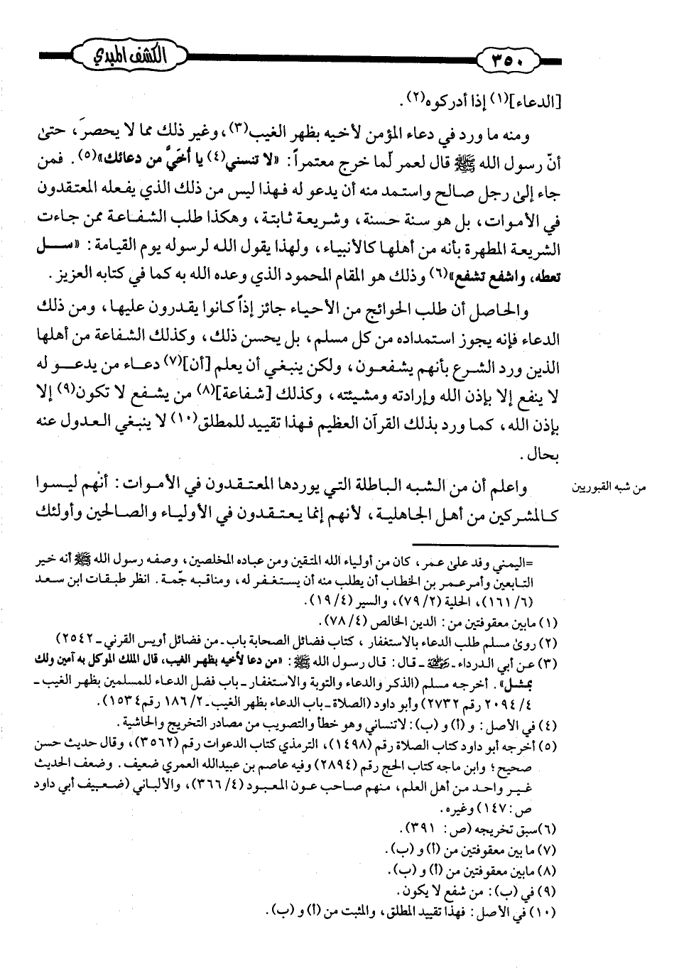 فمَن جاء إلى رجل صالح واستمدّ منه أن يدعو له؛ فهذا ليس من ذلك الذي يفعله المعتقدون في الأموات؛ بل هو سُنّة حسنة، وشريعة ثابتة، وهكذا طلب الشّفاعة ممّن جاءت الشّريعة المطهرة بأنّه من أهلها ـ كالأنبياء ـ؛ ولهذا يقول الله لرسوله يوم القيامة: «سَل تُعطه، واشْفع تُشفّع» ، وذلك هو المقام المحمود الذي وعده الله به؛ كما في كتابه العزيز.