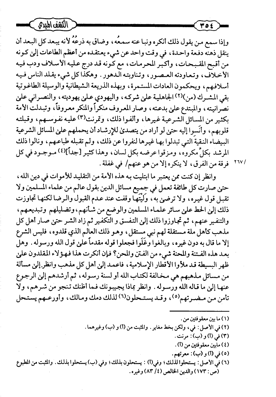عن شيء يعتقده من أعظم الطّاعات إلى كونه من أقبح المقبّحات وأكبر المحرّمات، مع كونه قد درج عليه الأسلاف ودبّ فيه الأخلاف، وتعاودته العصور وتناوبته الدّهور، وهكذا كلّ شيء يقلّد النّاس فيه أسلافهم، ويحكّمون العادات المستمرة، وبهذه الذّريعة الشّيطانية، والوسيلة الطّاغوتية بقى المشرك من الجاهليّة على شركه، واليهوديّ على يهوديّته، والنّصراني على نصرانيّته، والمبتدع على بدعته، وصار المعروف منكرًا والمنكر معروفًا، وتبدّلت الأُمّة بكثير من المسائل الشّرعية غيرها، وألفوا ذلك، وتمرّنت عليه نفوسهم، وقبلته قلوبهم، ووأنسوا إليه حتى لو أراد مَن يتصدّى للإرشاد أن يحملهم على المسائل الشّرعيّة البيضاء النّقيّة التي تبدّلوا بها غيرها لنفروا عن ذلك، ولم تقبله طباعهم، ونالوا ذلك المرشد بكلّ مكروه، ومزّقوا عرضه بكلّ لسان، وهذا كثير [جدًّا] موجود في كلّ فرقة من الفرق، لا ينكره إلَّا مَن هو عنهم في غفلة.