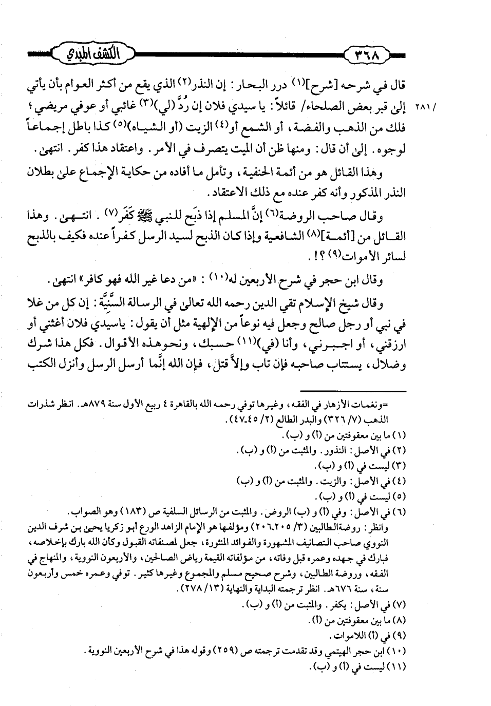 قال في شرحه [ «شرح] درر البحار» : إنّ النّذر الذي يقع من أكثر العوامّ بأن يأتي إلى قبر بعض الصّلحاء قائلًا: يا سيدي فلان؛ إن رُدّ لي غائبي أو عُوفي مريضي؛ فلك من الذّهب والفضّة، أو الشّمع، أو الزّيت، أو الشّياه كذا؛ باطل إجماعًا؛ لوجوه. إلى أن قال: ومنها: ظنّ أنّ الميّت يتصرّف في الأمر، واعتقاد هذا كفر. انتهى.
