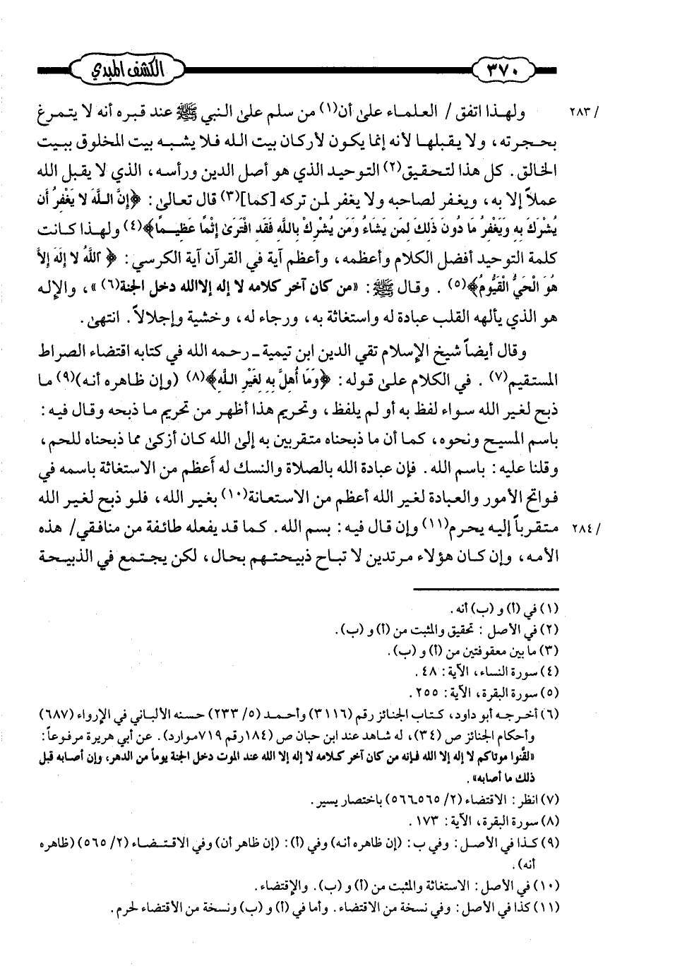 ولهذا اتّفق العلماء على أنّ مَن سلّم على النّبيّ صلى الله عليه وسلم عند قبره أنّه لا يتمرّغ بحُجرته ولا يقبّلها؛ لأنّه إنّما يكون لأركان بيت الله فلا يشبّه بيت المخلوق ببيت الخالق؛ كلّ هذا لتّحقيق التّوحيد الذي هو أصل الدِّين ورأسه، الذي لا يقبل الله عملًا إلَّا به، ويغفر لصاحبه، ولا يغفر لمَن تركه؛ [كما] قال الله ـ تعالى ـ: {إنّ الله لا يغفر أن يشرك به ويغفر ما دون ذلك لمن يشاء ومَن يُشرك بالله فقد افترى إثمًا عظيمًا} ؛ ولهذا كانت كلمة التّوحيد أفضل الكلام وأعظمه، وأعظم آية في القرآن آية الكرسي: {الله لا إله إلَّا هو الحيّ القيّوم} ، وقال صلى الله عليه وسلم: «مَن كان آخر كلامه (لا إله إلَّا الله) دخل الجنّة» ، والإله هو الذي يألهه القلب عبادة له واستغاثة به ورجاء له وخشية وإجلالًا. انتهى.