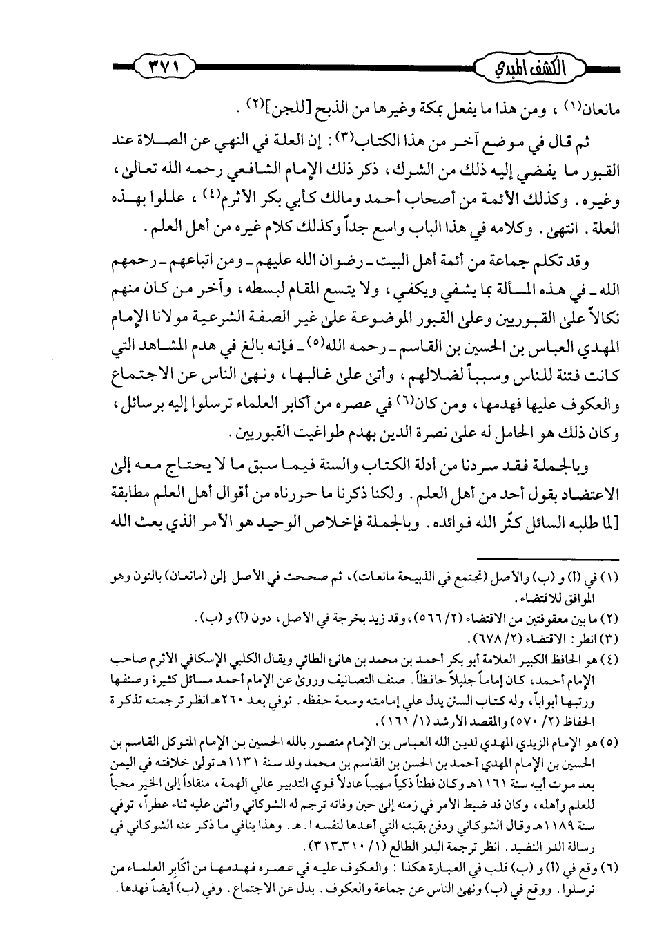 وقد تكلّم جماعة من أئمّة أهل البيت ـ رضوان الله عليهم ـ ومن أتباعهم ـ رحمهم الله ـ في هذه المسألة بما يشفي ويكفي، ولا يتّسع المقام لبسطه، وآخر مَن كان منهم نكالًا على القبوريّين وعلى القبور الموضوعة على غير الصّفة الشّرعيّة مولانا الإمام المهديّ العبّاس بن الحسين بن القاسم ـ رحمه الله ـ؛ فإنّه بالغ في هدم المشاهد التي كانت فتّنة للنّاس وسببًا لضلالهم، وأتى على غالبها، ونهي النّاس عن الاجتماع والعكوف عليها؛ فهدمها، ومَن كان في عصره من أكابر العلماء ترسّلوا إليه برسائل، وكان ذلك هو الحامل له على نصرة الدّين بهدم طواغيت القبوريّين.