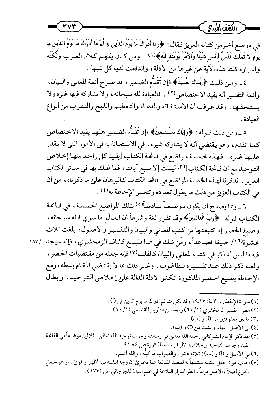 فهذه خمسة مواضع في فاتحة الكتاب؛ [يفيد كلّ واحد منها: إخلاص التّوحيد. مع أنّ فاتحة الكتاب] ليست إلَّا سبع آيات؛ فما ظنّك بما في سائر الكتاب العزيز؛ فذكرنا لهذه الخمسة المواضع في فاتحة الكتاب كالبرهان على ما ذكرناه من أنّ في الكتاب العزيز من ذلك ما يطول تعداده، وتتعسّر الإحاطة به.