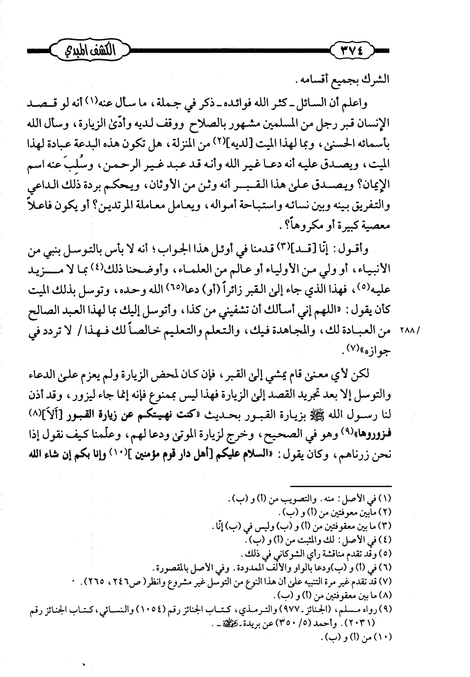 واعلم أنّ السّائل ـ كثّر الله فوائده ـ ذكر في جملة ما سأل عنه: أنّه لو قصد الإنسان قبر رجل من المسلمين مشهور بالصّلاح، ووقف لديه وأدّى الزّيارة، وسأل الله بأسمائه الحسنى، وبما لهذا الميّت [لديه] من المنزلة؛ هل تكون هذه البدعة عبادة لهذا الميّت، ويصدق عليه أنّه دعا غير الله، وأنّه قد عبد غير الرّحمن، وسُلِبَ عنه اسم الإيمان؟! ويصدق على هذا القبر أنّه وثن من الأوثان، ويحكم بردّة ذلك الدّاعي، والتّفريق بينه وبين نسائه، واستباحة أمواله، ويُعامل معاملة المرتدّين؟ أو يكون فاعلًا معصيّة كبيرة أو مكروهًا؟