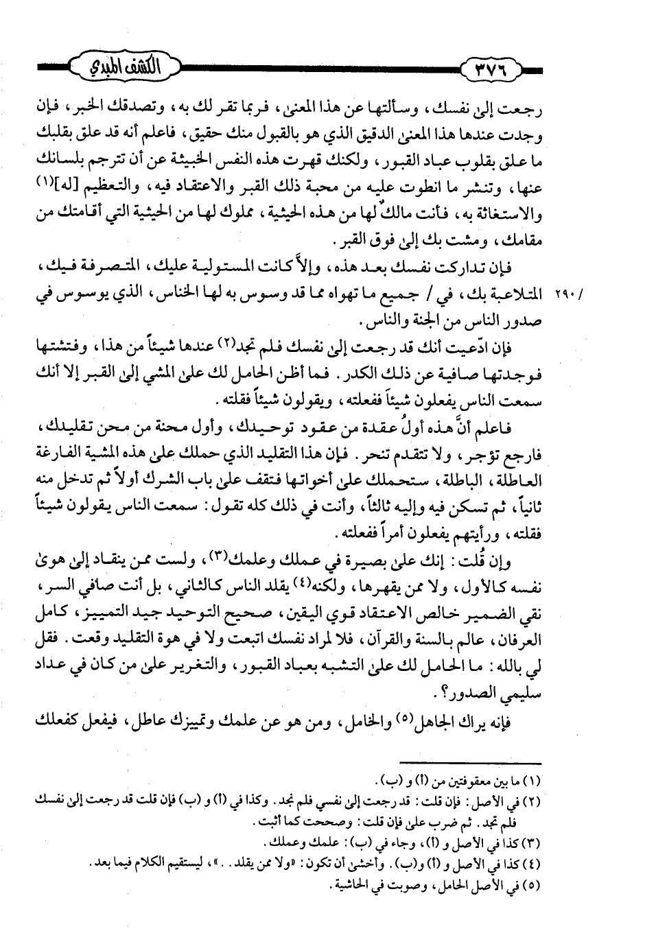 رجعتَ إلى نفسك وسألتَها عن هذا المعنى؛ فربّما تقرّ لك به، وتصدقك الخبر؛ فإن وجدتَ عندها هذا المعنى الدّقيق الذي هو بالقبول منك حقيق؛ فاعلم أنّه قد علق بقلبك ما علق بقلوب عبّاد القبور، ولكنّك قهرت هذه النّفس الخبيثة عن أن تترجم بلسانك عنها، وتنشر ما انطوت عليه من محبّة ذلك القبر والاعتقاد فيه، والتّعظيم [له] ، والاستغاثة به؛ فأنت مالك لها من هذه الحيثيّة، مملوك لها من الحيثيّة التي أقامتك من مقامك، ومشت بك إلى فوق القبر!