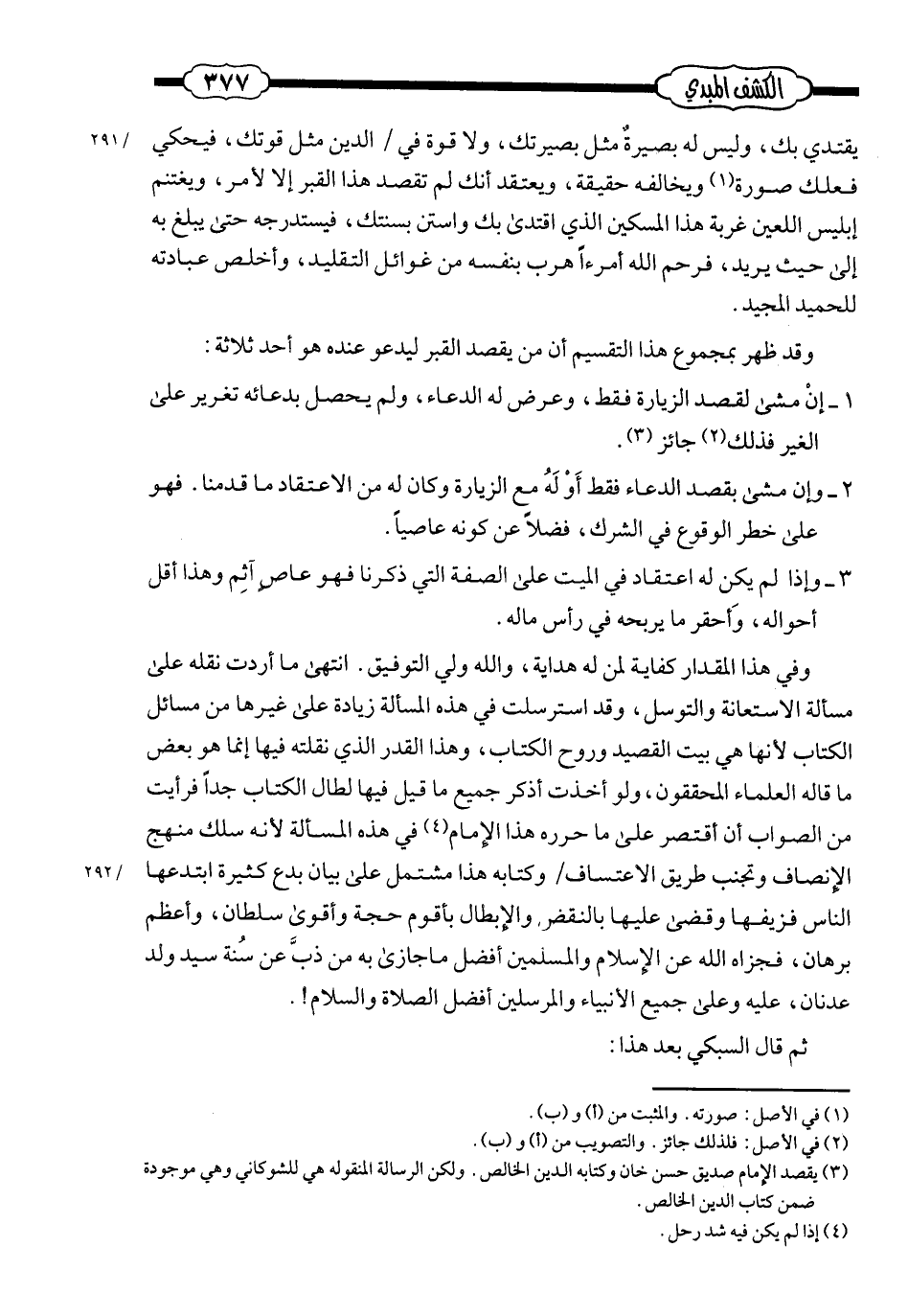 يقتدي بك، وليس له بصيرة مثل بصيرتك، ولا قوّة في الدّين مثل قوّتك؛ فيحكى فعلك صورة، ويخالفه حقيقة، ويعتقد أنّك لم تقصد هذا القبر إلَّا لأمر، ويغتنم إبليس اللّعين غربة هذا المسكين الذي اقتدى بك واستنّ بسُنّتك؛ فيستدرجه حتى يبلغ به إلى حيث يريد. فرحم الله امرءًا هرب بنفسه من غوائل التّقليد، وأخلص عبادته للحميد المجيد.