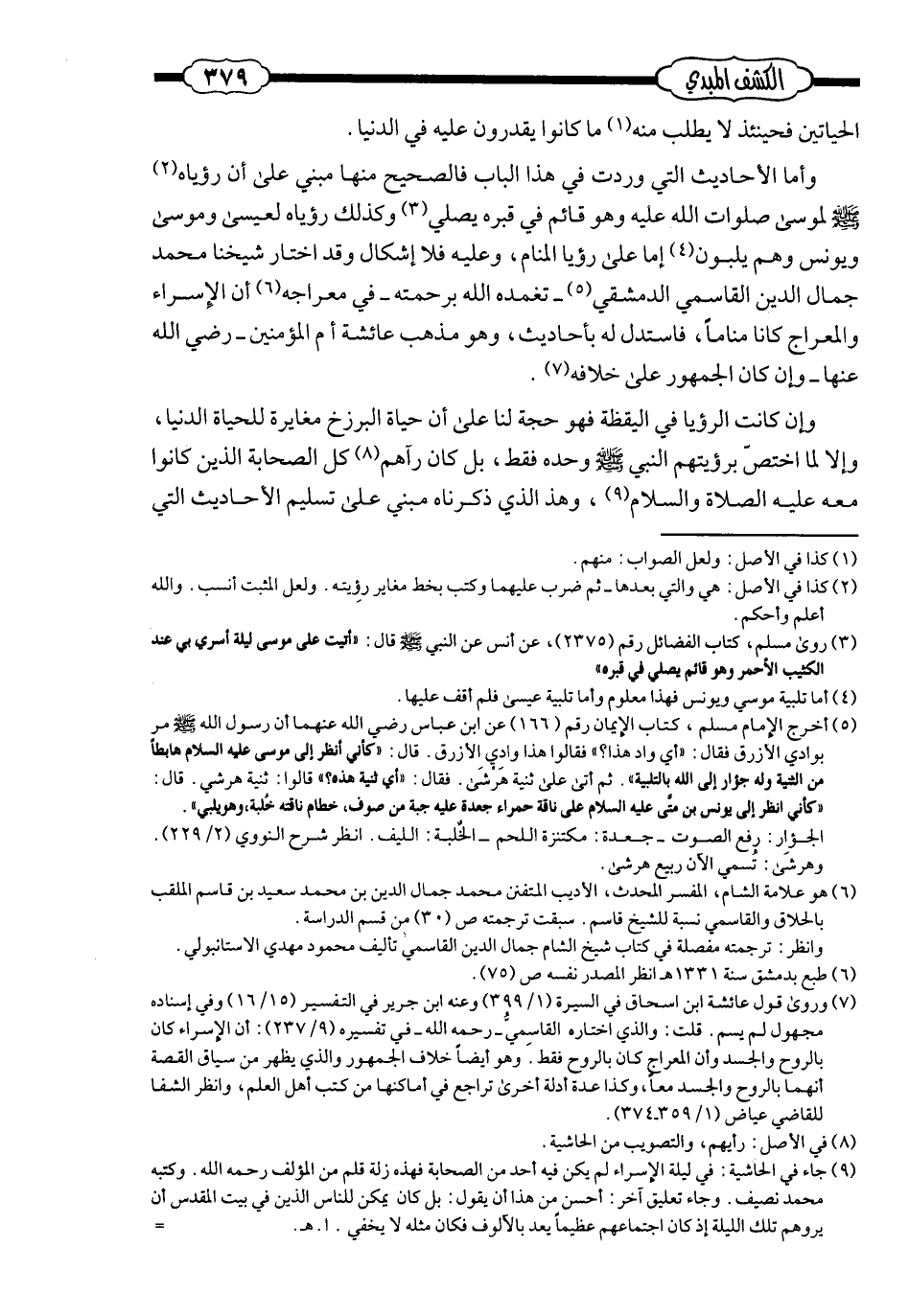 وأمّا الأحاديث التي وردت في هذا الباب: فالصّحيح منها مبنيّ على أنّ رؤياه صلى الله عليه وسلم لموسى ـ صلوات الله عليه ـ وهو قائم يصلّي، وكذلك رؤياه لعيسى وموسى ويونس وهم يلبّون؛ إمّا على رؤيا المنام؛ وعليه؛ فلا إشكال، وقد اختار شيخنا محمّد جمال الدّين القاسميّ الدّمشقيّ ـ تغمّده الله برحمته ـ في «معراجه» : أنّ الإسراء والمعراج كان منامًا؛ فاستدلّ له بأحاديث، وهو مذهب عائشة أمّ المؤمنين ـ رضي الله عنها ـ، وإن كان الجمهور على خلافه.