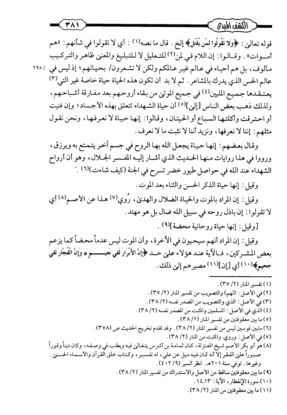 ـ قوله (تعالى) : {ولا تقولوا لمَن يُقتل} إلخ ـ؛ قال ما نصّه: «أي: لا تقولوا في شأنهم: هم أموات. وقالوا: إنّ اللّام في (لمَن) للتّعليل لا للتّبليغ. والمعنى ظاهر، والتّركيب مألوف، بل هم أحياء في عالم غير عالمكم، ولكن لا تشعرون بحياتهم؛ إذ ليس في عالم الحسّ الذي يدرك بالمشاعر. ثم لا بُدّ أن تكون هذه الحياة حياة خاصّة غير التي يعتقدها جميع المليين في جميع الموتى من بقاء أرواحهم بعد مفارقة أشباحهم؛ ولذلك ذهب بعض النّاس [إلى] أنّ حياة الشّهداء تتعلّق بهذه الأجساد، وإن فنيت أو احترقت وأكلتها السّباع والحيتان؛ وقالوا: إنّها حياة لا نعرفها، ونحن نقول مثلهم: إنّنا لا نعرفها، ونزيد: أنّنا لا نثبت ما لا نعرف.