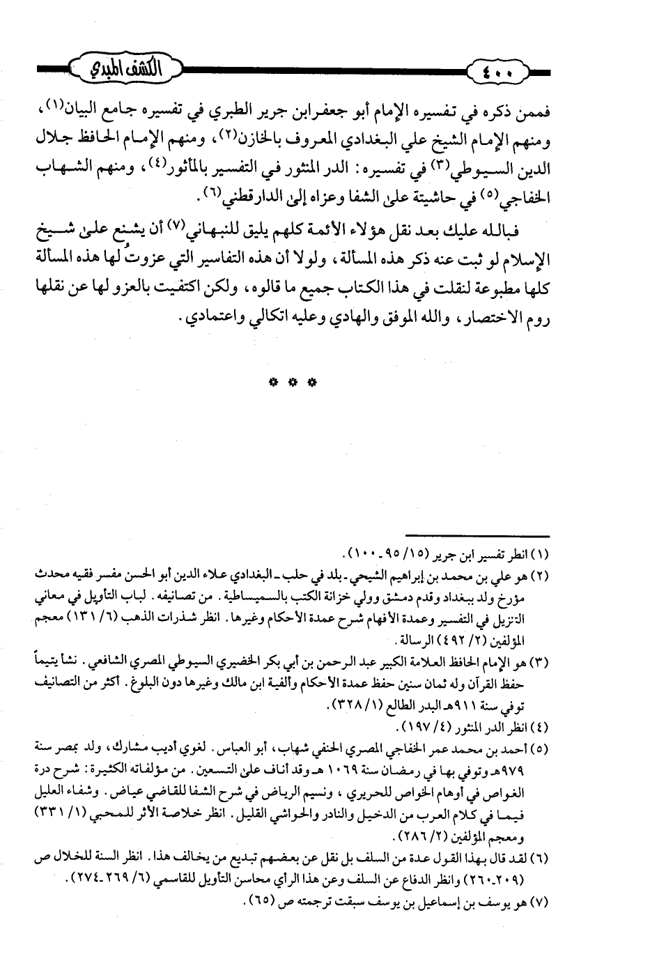فبالله عليكَ؛ بعد نقل هؤلاء الأئمّة كلّهم؛ يليق للنّبهانيّ أن يشنّع على شيخ الإسلام ـ لو ثبت عنه ذكر هذه المسألة ـ؟! ولولا أنّ هذه التّفاسير التي عزوتُ لها هذه المسألة كلّها مطبوعة؛ لنقلتُ في هذا الكتاب جميع ما قالوه؛ ولكن اكتفيتُ بالعزو لها عن نقلها روم الاختصار. والله الموفّق والهادي، وعليه اتّكالي واعتمادي.
