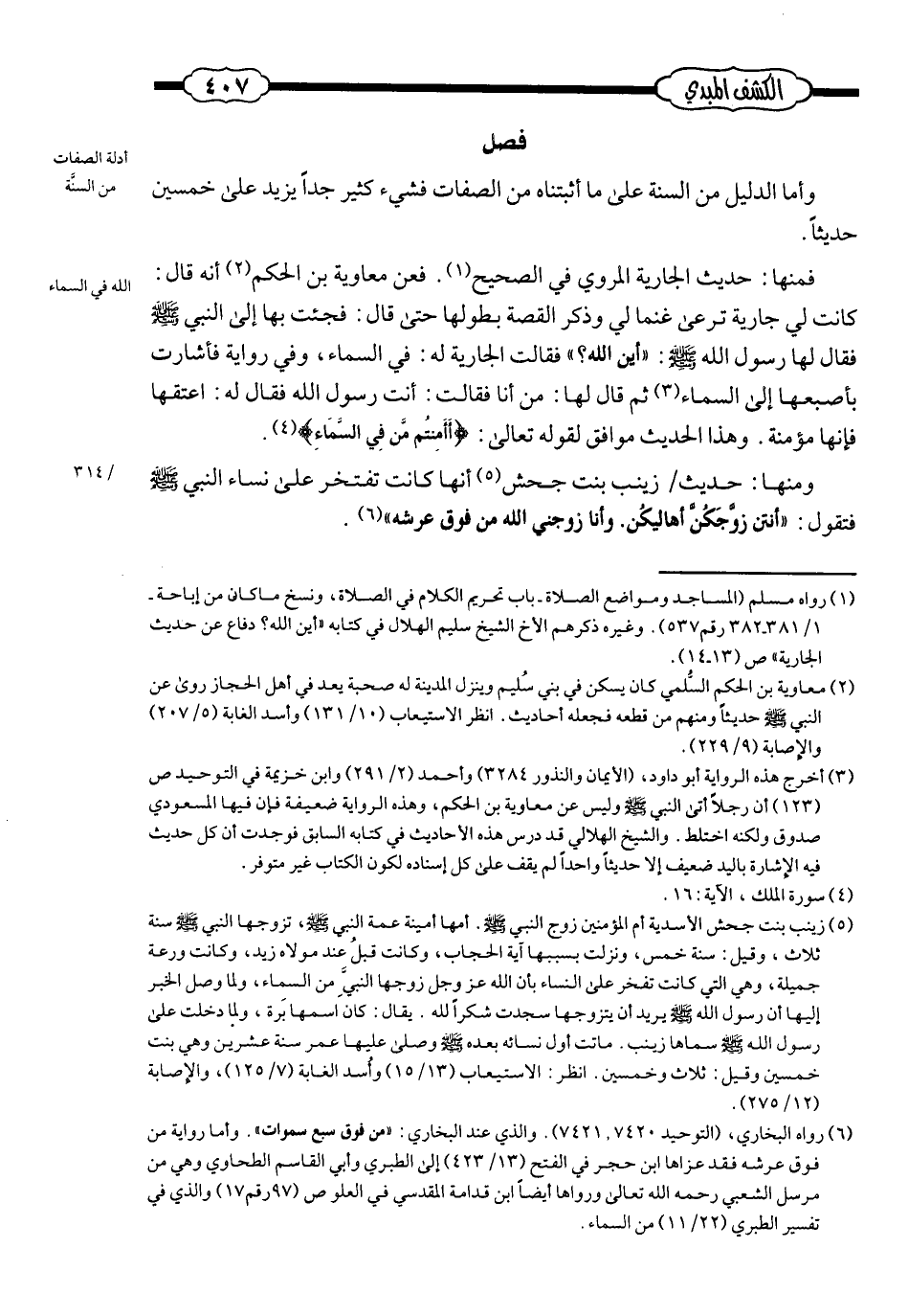 فمنها: حديث الجارية ـ المرويّ في «الصّحيح» ـ؛ فعن معاوية بن الحكم أنّه قال: كانت لي جارية ترعى غنمًا لي ... وذكر القصّة بطولها، حتى قال: فجئتُ بها إلى النّبيّ صلى الله عليه وسلم؛ فقال لها رسول الله صلى الله عليه وسلم: «أين الله؟» فقالت الجارية له: في السّماء ـ وفي رواية: فأشارت بأصبعها إلى السّماء ـ، ثم قال لها: «مَن أنا؟» ؛ فقالت: أنتَ رسول الله؛ فقال له: أعتقها؛ فإنّها مؤمنة.
