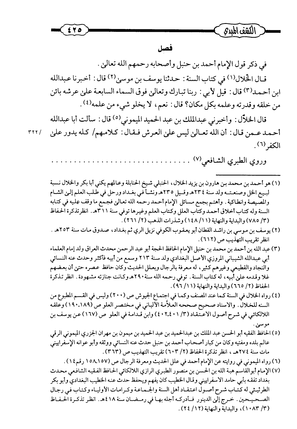 قال الخلّال: وأخبرني عبد الملك بن عبد الحميد الميمونيّ قال: سألتُ أبا عبد الله أحمد عمّن قال: إنّ الله ـ تعالى ـ ليس على العرش؛ فقال: «كلامهم كلّه يدور على الكفر» .