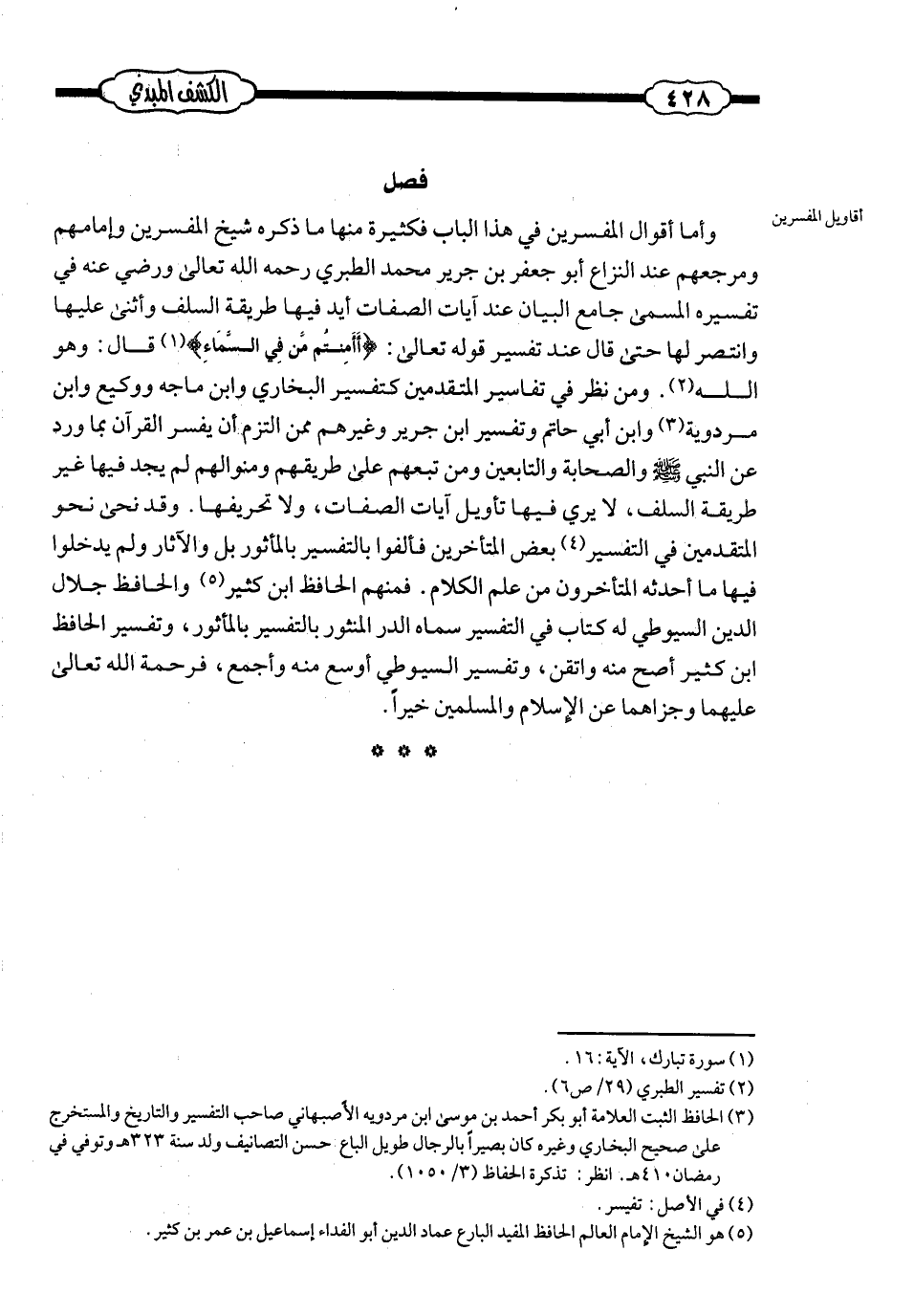 وأمّا أقوال المفسّرين في هذا الباب: فكثيرة؛ منها: ما ذكره شيخ المفسّرين وإمامهم ومرجعهم عند النّزاع: أبو جعفر بن جرير محمد الطّبريّ ـ رحمه الله تعالى ورضي عنه ـ، في تفسيره المسمّى «جامع البيان» ، عند آيات الصّفات؛ أيّد فيها طريقة السّلف وأثنى عليها وانتصر لها، حتى قال عند تفسير قوله ـ تعالى ـ: {أأمنتم من في السّماء} قال: «وهو الله» . ومَن نظر في تفاسير المتقدّمين ـ كتفسير البخاريّ وابن ماجه ووكيع وابن مردويه وابن أبي حاتم وتفسير ابن جرير، وغيرهم ممّن التزم أن يفسّر القرآن بما ورد عن النّبيّ صلى الله عليه وسلم والصّحابة والتّابعين ومَن تبعهم على طريقهم ومنوالهم ـ؛ لم يجد فيها غير طريقة السّلف، لا يرى فيها تأويل آيات الصّفات، ولا تحريفها. وقد نحى نحو المتقدّمين في التّفسير بعض المتأخّرين؛ فألّفوا بالتّفسير بالمأثور بل والآثار، ولم يدخلوا فيها ما أحدثه المتأخّرون من علم الكلام؛ فمنهم: الحافظ ابن كثير، والحافظ جلال الدّين السّيوطيّ له كتاب في التّفسير سمّاه: «الدّرّ المنثور بالتّفسير بالمأثور» ، وتفسير الحافظ ابن كثير أصحّ منه وأتقن، وتفسير السّيوطيّ أوسع منه وأجمع؛ فرحمة الله ـ تعالى ـ عليهما، وجزاهما عن الإسلام والمسلمين خيرًا.