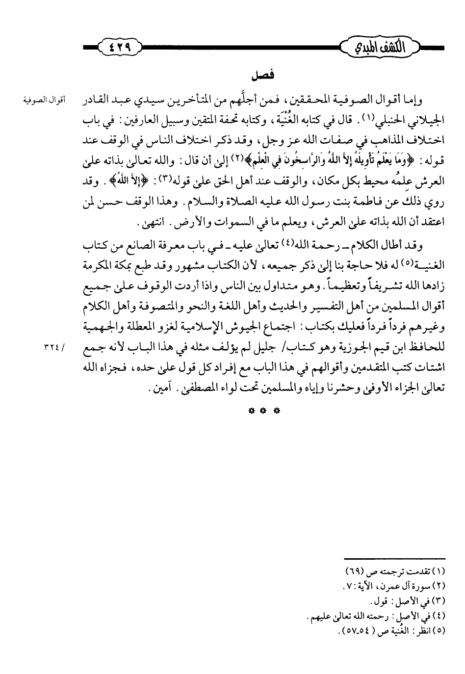 وأمّا أقوال الصّوفيّة المحقّقين: فمن أجلّهم من المتأخّرين: سيدي عبد القادر الجيلانيّ الحنبليّ؛ قال في كتابه «الغُنية» وكتابه «تحفة المتّقين وسبيل العارفين» ، في باب: اختلاف المذاهب في صفات الله ـ عزّ وجلّ ـ، وقد ذكر اختلاف النّاس في الوقف عند قوله: {وما يعلم تأويله إلَّا الله والرّاسخون في العلم} ، إلى أن قال: «والله ـ تعالى ـ بذاته على العرش، علمه محيط بكلّ مكان، والوقف عند أهل الحقّ على قوله: {إلَّا الله} . وقد رُوي ذلك عن فاطمة بنت رسول الله ـ عليه الصّلاة والسّلام ـ، وهذا الوقف حسن لمَن اعتقد أنّ الله بذاته على العرش، ويعلم ما في السّماوات والأرض» انتهى.