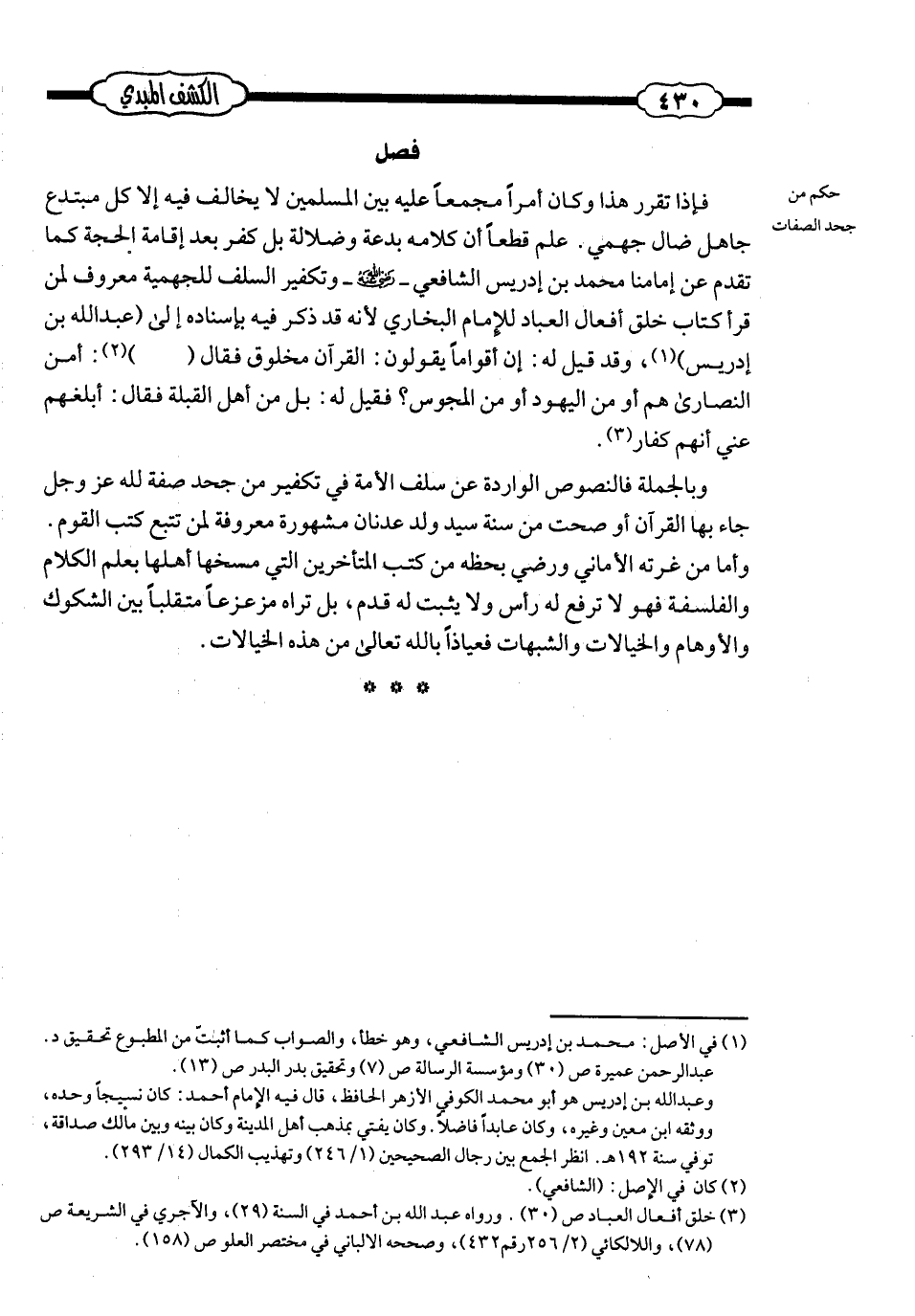 فإذا تقرّر هذا وكان أمرًا مجمعًا عليه بين المسلمين؛ لا يخالف فيه إلَّا كّل مبتدع جاهل ضالّ جهميّ؛ علم قطعًا أنّ كلامه بدعة وضلالة، بل كفر، بعد إقامة الحُجّة؛ كما تقدّم عن إمامنا محمّد بن إدريس الشّافعيّ ـ رضي الله عنه ـ، وتكفير السّلف للجهميّة معروف لمَن قرأ كتاب «خلق أفعال العباد» للإمام البخاريّ؛ لأنّه قد ذكر فيه بإسناده إلى عبد الله بن إدريس، وقد قيل له: إنّ أقوامًا يقولون: القرآن مخلوق؛ فقال: أمن النّصارى هم أو من اليهود أو من المجوس؟ فقيل له: بل من أهل القبلة! فقال: أبلغهم عنّي أنّهم كفّار.