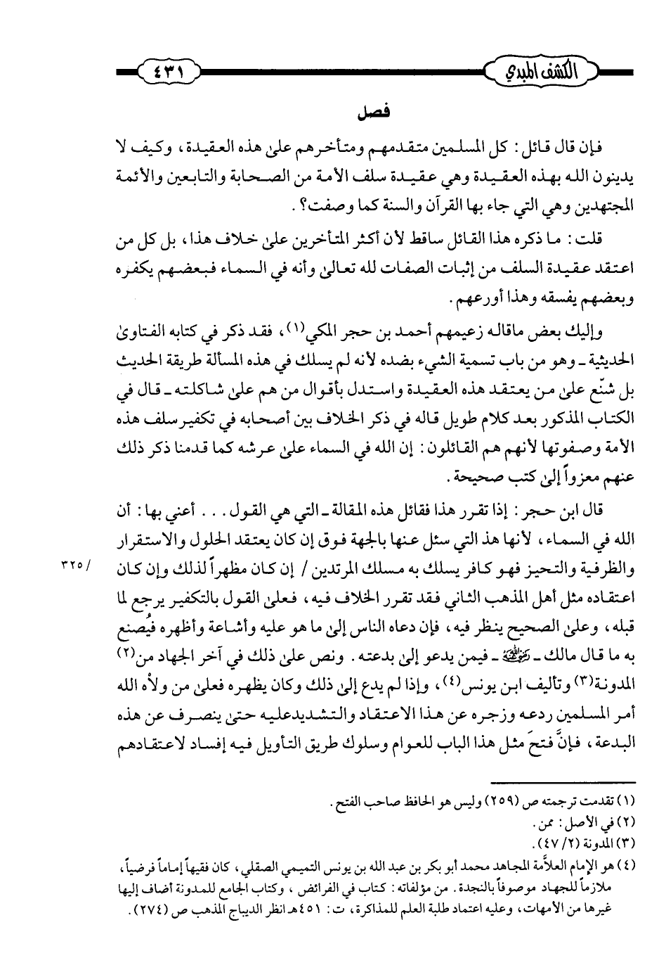 وإليك بعض ما قاله زعيمهم أحمد بن حجر المكيّ؛ فقد ذكر في كتابه «الفتاوى الحديثيّة» ـ وهو من باب تسمية الشيء بضدّه؛ لأنّه لم يسلك في هذه المسألة طريقة الحديث؛ بل شنّع على مَن يعتقد هذه العقيدة، واستدلّ بأقوال مَن هم على شاكلته ـ؛ قال في الكتاب المذكور، بعد كلام طويل قاله في ذكر الخلاف بين أصحابه في تكفير سلف هذه الأُمّة وصفوتها؛ لأنّهم هم القائلون: إنّ الله في السّماء على عرشه ـ كما قدّمنا ذكر ذلك عنهم، معزوًّا إلى كتب صحيحة ـ؛ قال ابن حجر:
