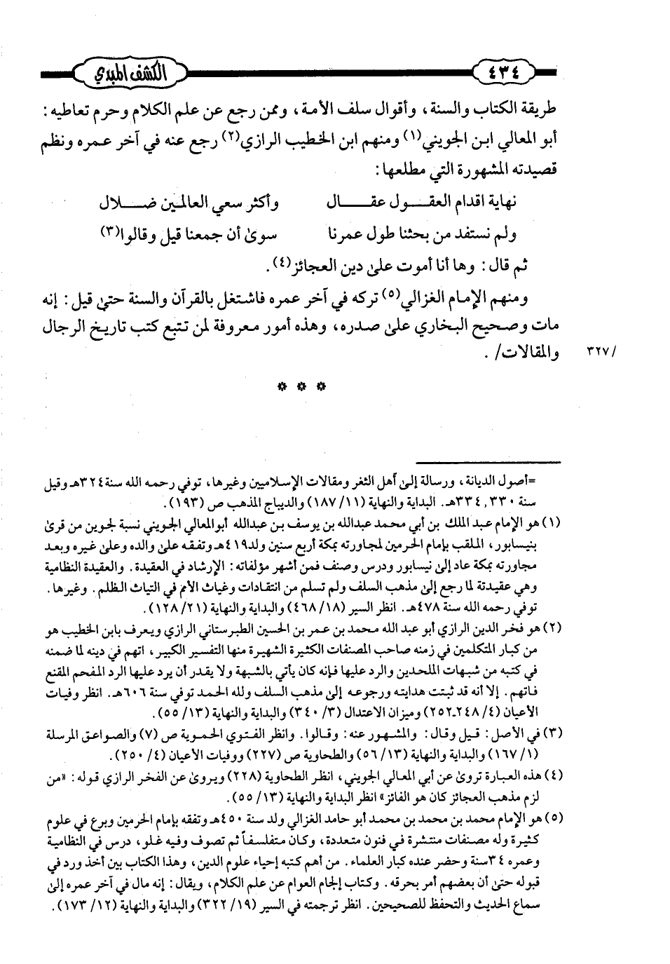 طريقة الكتاب والسُّنّة وأقوال سلف الأُمّة. وممّن رجع عن علم الكلام وحرم تعاطيه: أبو المعالي ابن الجوينيّ، ومنهم: ابن الخطيب الرّازيّ، رجع عنه في آخر عمره، ونظم قصيدته المشهورة التي مطلعها: