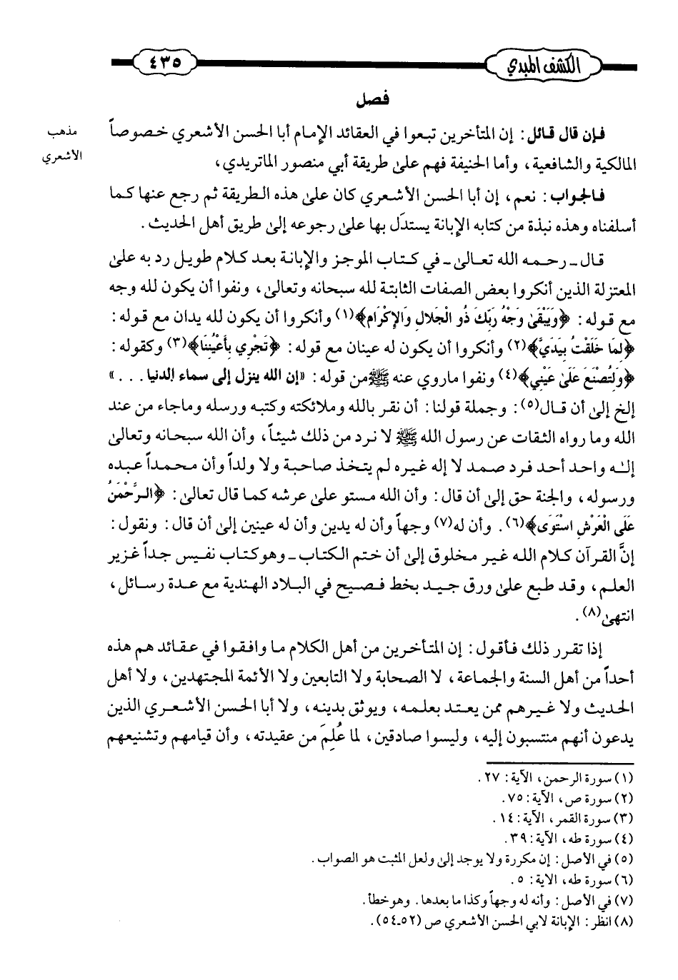 إذا تقرّر ذلك؛ فأقول: إنّ المتأخّرين من أهل الكلام ما وافقوا في عقائدهم هذه أحدًا من أهل السُّنّة والجماعة، لا الصّحابة ولا التّابعين ولا الأئمّة المجتهدين، ولا أهل الحديث ولا غيرهم ممّن يعتدّ بعلمه ويوثق بدينه، ولا أبا الحسن الأشعريّ الذين يدّعون أنّهم منتسبون إليه، وليسوا صادقين؛ لما عُلم من عقيدته، وأنّ قيامهم وتشنيعهم
