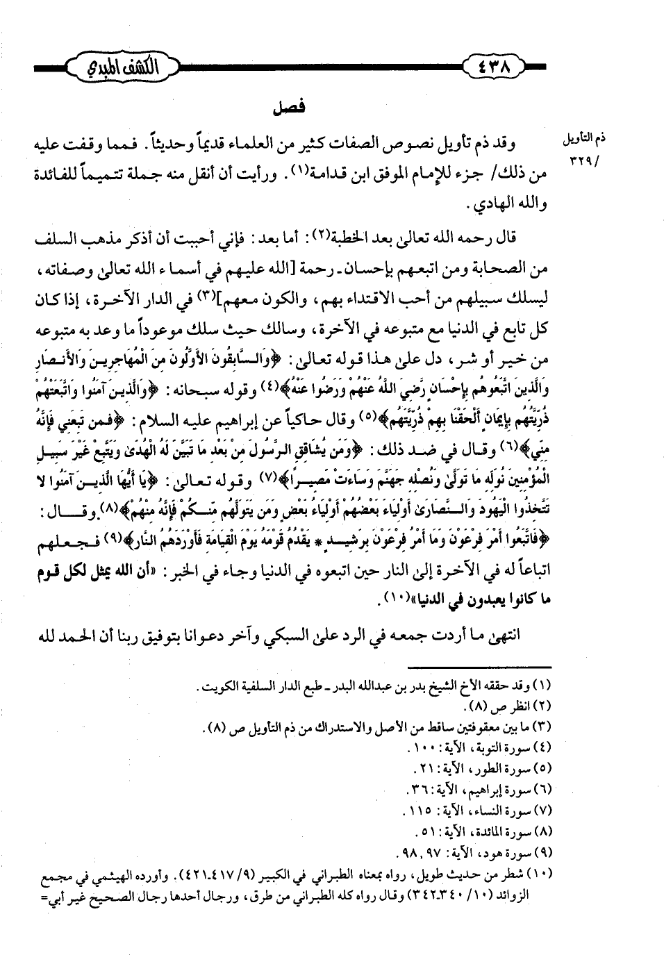 وقد ذّمّ تأويل نصوص الصّفات كثير من العلماء قديمًا وحديثًا؛ فممّا وقفتُ عليه من ذلك جزء للإمام الموفّق ابن قدامة، ورأيتُ أن أنقل منه جملة تتميمًا للفائدة. والله الهادي.