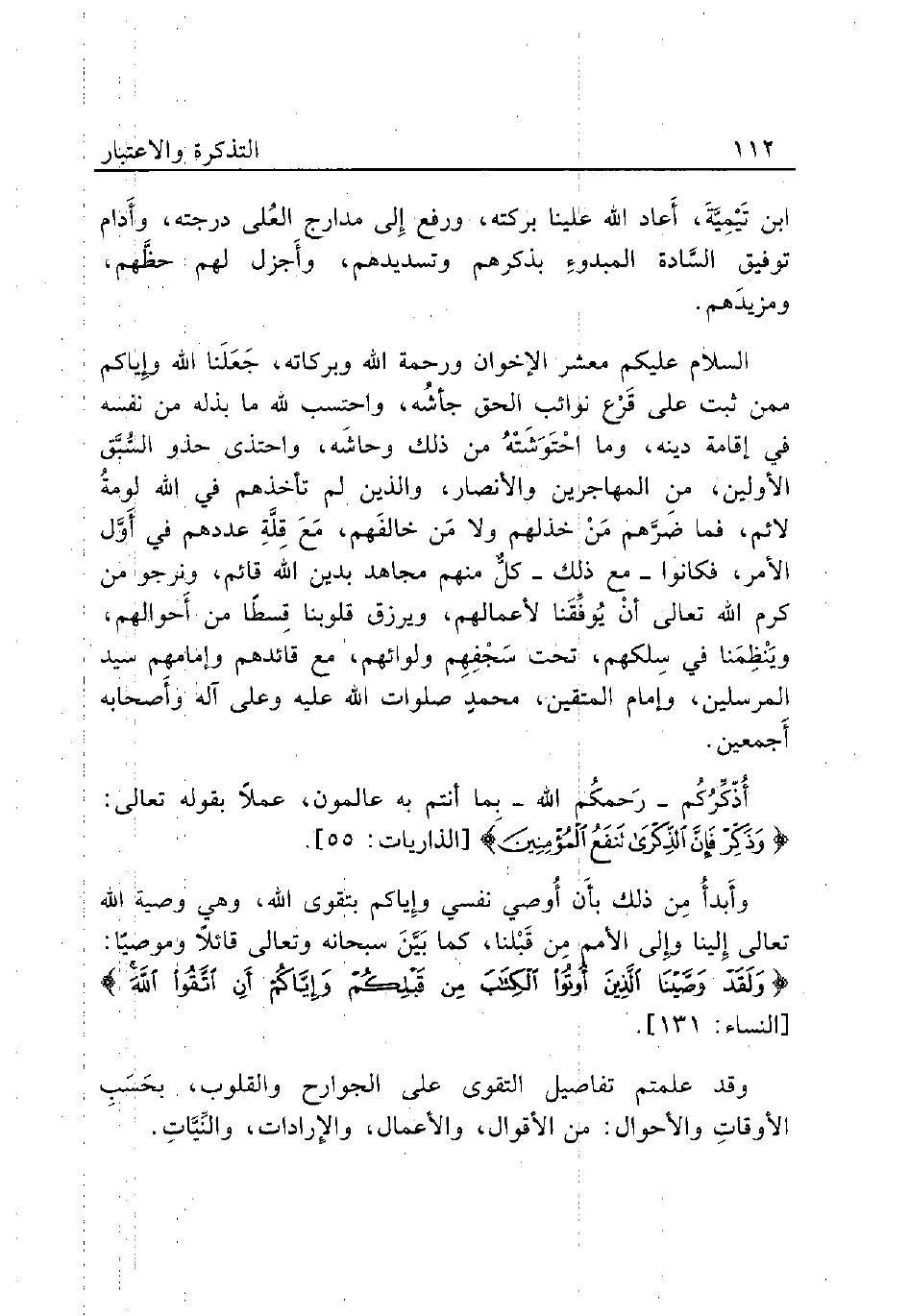 ابن تَيْمِيَّةَ، أَعاد الله علينا بركته، ورفع إِلى مدارج العلى درجته، وأَدام توفيق السَّادة المبدوءِ بذكرهم وتسديدهم، وأَجزل لهم حظَّهم، ومزيدَهم.