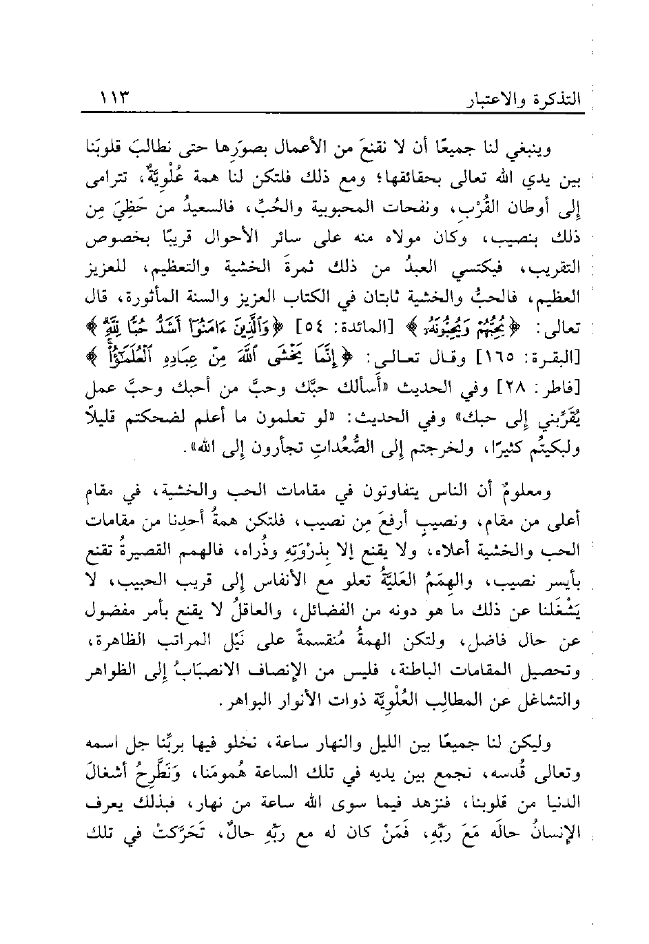 وينبغي لنا جميعاً أن لا نقنعَ من الأعمال بصوَرِها حتى نطالبَ قلوبَنا بين يدي الله تعالى بحقائقها؛ ومع ذلك قلتكن لنا همة عُلْوِيَّةٌ، تترامى إِلى أوطان القُرْبِ، ونفحات المحبوبية والحُبِّ، فالسعيدُ من حَظِيَ مِن ذلك بنصيب، وكان مولاه منه على سائر الأحوال قريباً بخصوص التقريب، فيكتسي العبدُ من ذلك ثمرةَ الخشية والتعظيم، للعزيز العظيم، فالحبُّ والخشية ثابتان في الكتاب العزيز والسنة المأثورة، قال تعالى: {يُحِبُّهُمْ وَيُحِبُّونَهُ} [المائدة: 54] {وَالَّذِينَ آمَنُوا أَشَدُّ حُبًّا لِلَّهِ} [البقرة: 165] وقال تعالى: {إِنَّمَا يَخْشَى اللَّهَ مِنْ عِبَادِهِ الْعُلَمَاءُ} [فاطر: 28] وفي الحديث «أَسألك حبَّك وحبَّ من احبك وحبَّ عمل يُقَرِّبني إِلى حبك» وفي الحديث: «لو تعلمون ما أعلم لضحكتم قليلاً ولبكيتُم كثيراً، ولخرجتم إِلى الصُّعُداتِ تجأرون إِلى الله».