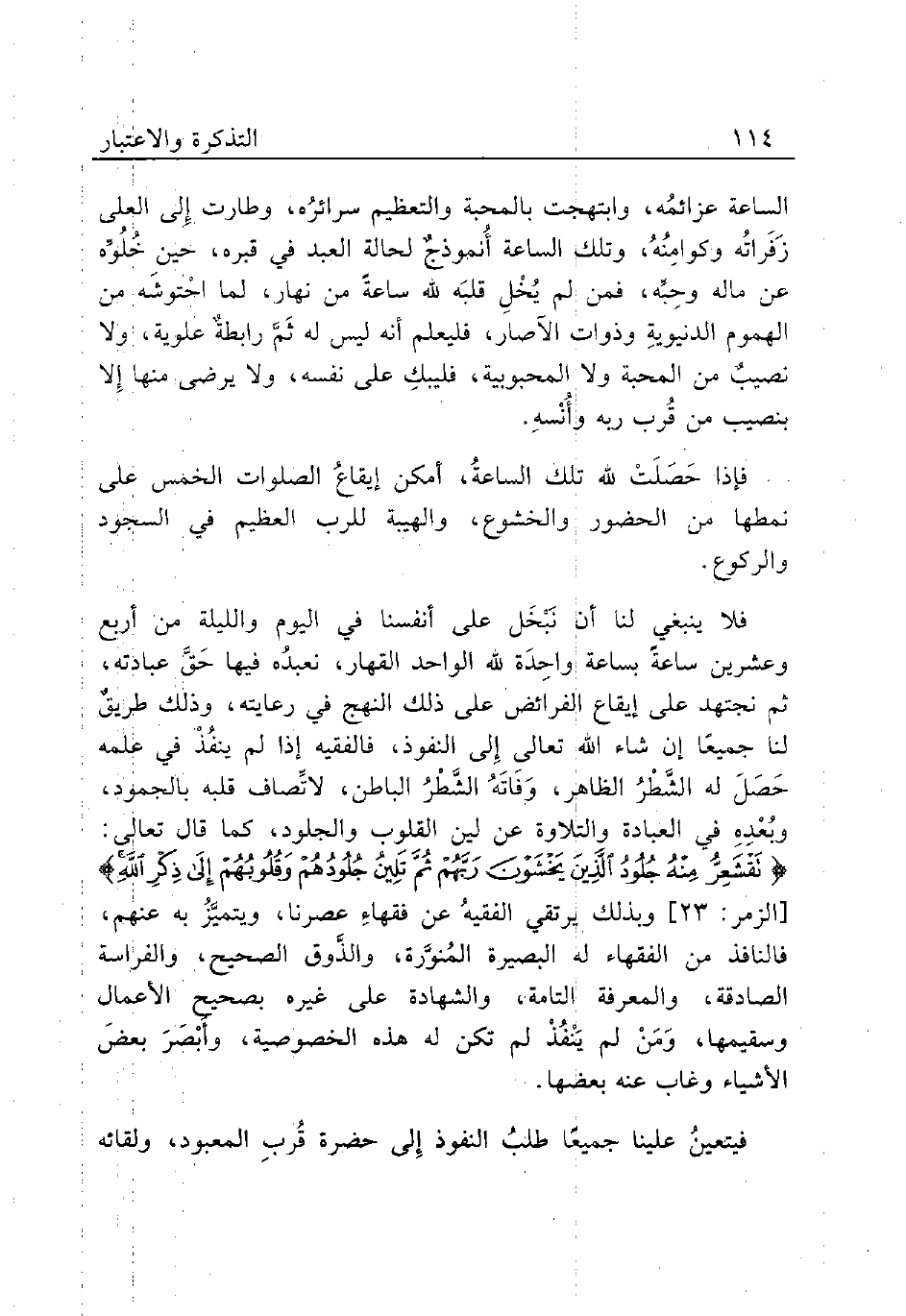 الساعة عزائمُه، وابتهجت بالمحبة والتعظيم سرائرُه، وطارت إِلى العلى زَفَراتُه وكوامِنُهُ، وتلك الساعة أُنموذجٌ لحالة العبد في قبره، حين خُلُوِّه عن ماله وحِبِّه، فمن لم يُخْلِ قلبَه لله ساعةً من نهار، لما احْتوشَه من الهموم الدنيويةِ وذوات الآصار، فليعلم أنه ليس له ثَمَّ رابطةٌ علوية، ولا نصيبٌ من المحبة ولا المحبوبية، فليبكِ على نفسه، ولا يرضى منها إِلا بنصيب من قُرب ربه وأُنْسهِ.