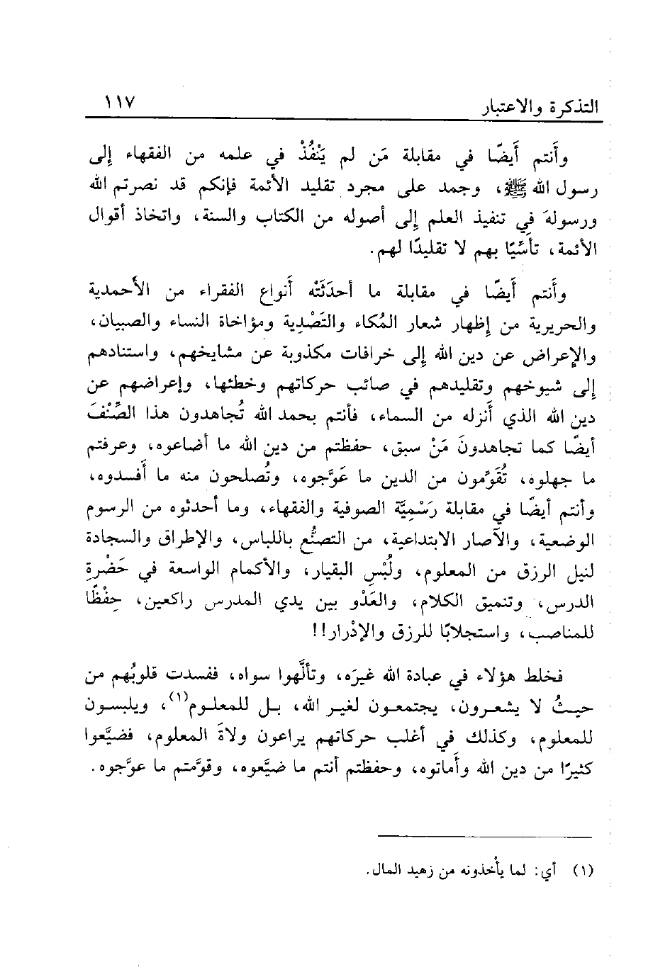 وأَنتم أَيضًا في مقابلة ما أحدَثَتْه أَنواع الفقراء من الأَحمدية والحريرية من إِظهار شغار المُكاء والتَصْدِية ومؤاخاة النساء والصبيان، والإِعراض عن دين الله إِلى خرافات مكذوبة عن مشايخهم، واستنادهم إِلى شيوخهم وتقليدهم في صائب حركاتهم وخطئها، وإعراضهم عن دين الله الذي أَنزله من السماء، فأنتم بحمد الله تُجاهدون هذا الصِّنْفَ أيضًا كما تجاهدونَ مَنْ سبق، حفظتم من دين الله ما أضاعوه، وعرفتم ما جهلوه، تُقَوِّمون من الدين ما عَوَّجوه، وتُصلحون منه ما أَفسدوه، وأنتم أيضًا في مقابلة رَسْمِيَّة الصوفية والفقهاء، وما أحدثوه من الرسوم الوضعية، والآصار الابتداعية، من التصنُّع باللباس، والإطراق والسجادة لنيل الرزق من المعلوم، ولُبْسِ البقيار، والأكمام الواسعة في حَضْرةِ الدرس، وتنميق الكلام، والعَدْو بين يدي المدرس راكعين، حِفْظًا للمناصب، واستجلابًا للرزق والإدْرار!!