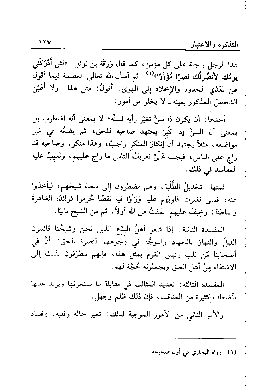 هذا الرجل واجبة على كل مؤمن، كما قال وَرَقَةَ بن نوفل: «لئن أَدْرَكَني يومُك لأنصُرنَّك نصرًا مُؤَزّرًا» (¬1). ثم أسأل الله تعالى العصمة فيما أقول عن تَعَدِّي الحدود والإِخلاد إِلى الهوى. أَقولُ: مثل هذا - ولا أُعَيِّن الشخصَ المذكور بعينه - لا يخلو من أمور:
