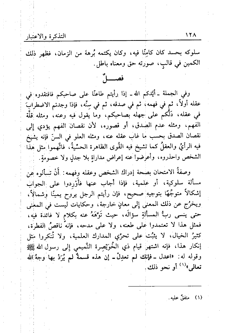 وصفةُ الامتحان بصحة إدراك الشخص وعقله وفهمه: أَنْ تسألوه عن مسألة سلوكية، أو علمية، فإذا أجاب عنها فأَوْرِدوا على الجواب إشكالاً متوجِّهًا بتوجيه صحيح، فإن رأيتم الرجل يروح يمينًا وشمالاً، ويخرُج عن ذلك المعنى إِلى معانٍ خارجة، وحكايات ليست في المعنى حتى ينسى ربُّ المسألةِ سؤالَه، حيث تَوَّهَهُ عنه بكلامٍ لا فائدة فيه، فمثل هذا لا تعتمدوا على طعنه، ولا على مدحه، فإنه ناقصُ بالفطرة، كثيرُ الخيال، لا يثبُت على تحرِّي المدارك العلمية، ولا تُنكروا مثل إنكار هذا، فإنه اشتهر قيام ذي الخُوَيْصِرة التَّميمي إِلى رسول الله صلى الله عليه وسلم وقوله له: «اعدل - فإنك لم تعدِلْ - إن هذه قسمةٌ لم يُرَدْ بها وجهُ الله تعالى» (¬1) أو نحو ذلك.