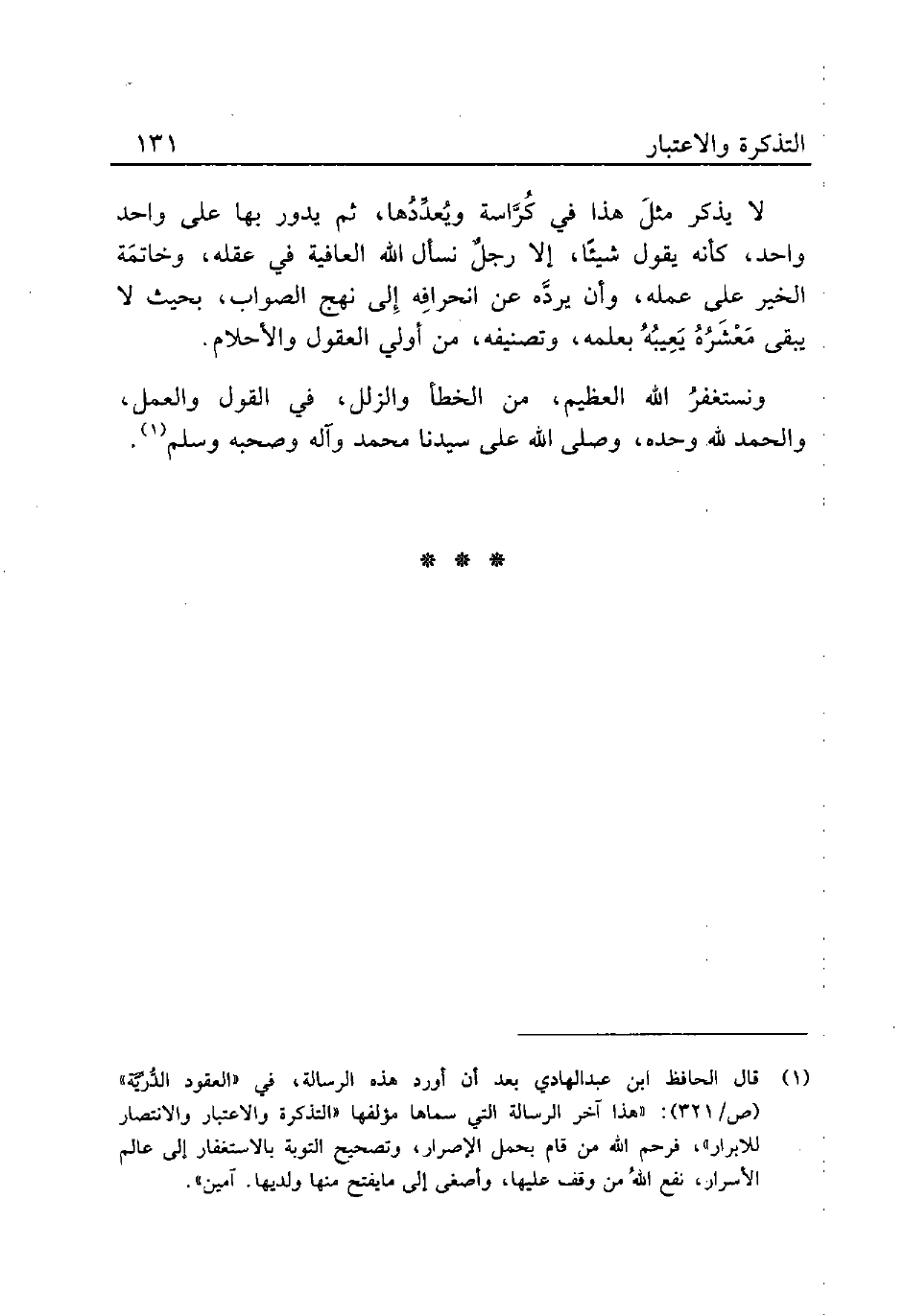 (¬1) قال الحافظ ابن عبد الهادي بعد أن أورد هذه الرسالة، في "العقود الدُّرِّيَّة" (ص/ 321): "هذا آخر الرسالة التي سماها مؤلفها "التذكرة والاعتبار والانتصار للأبرار"، فرحم الله من قام بحمل الإصرار، وتصحيح التوبة بالاستغفار إلى عالم الأسرار، نفع الله من وقف عليها، وأصغى إلى ما يفتح منها ولديها. آمين".