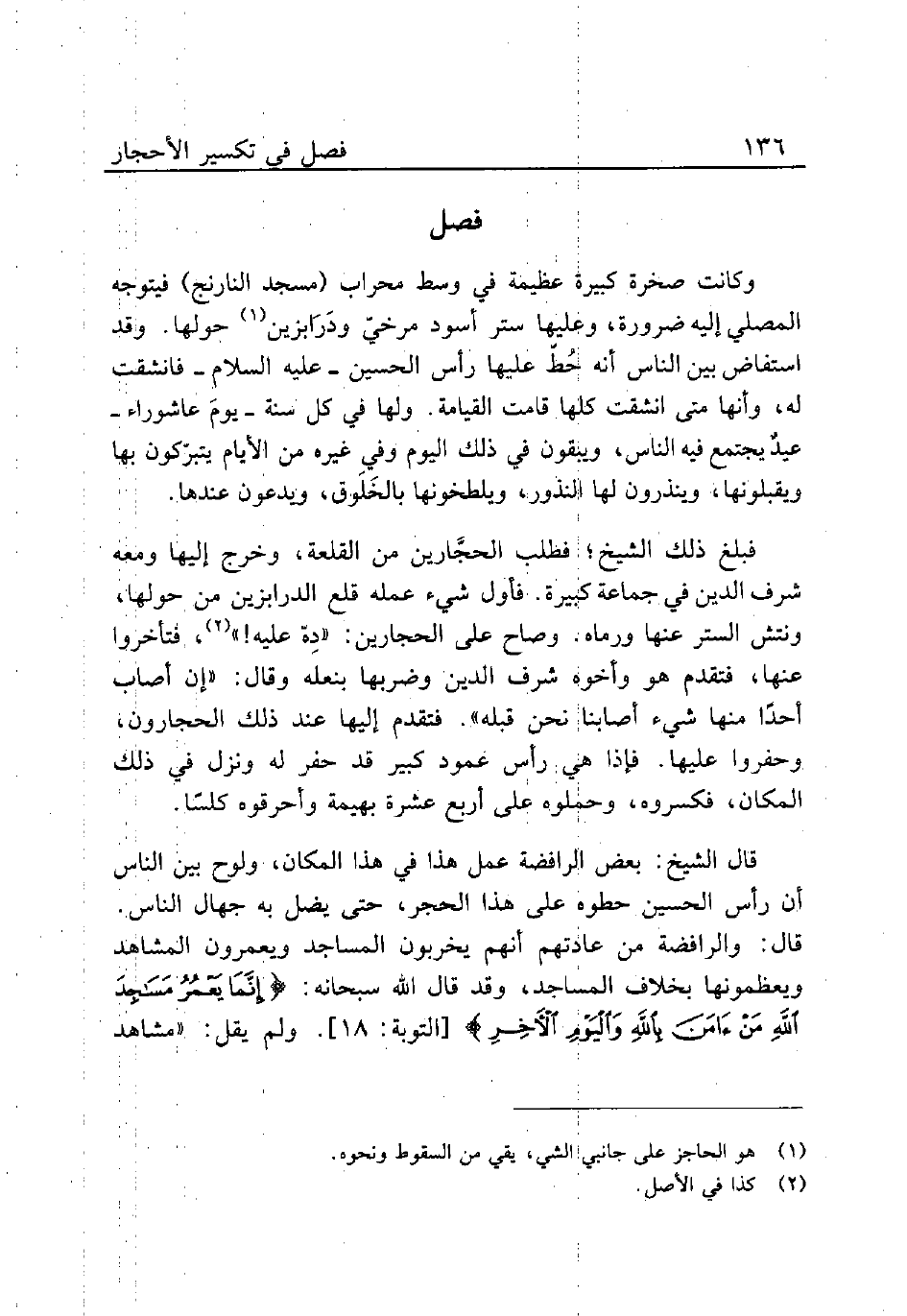 قال الشيخ: بعض الرافضة عمل هذا في هذا المكان، ولوح بين الناس أن رأس الحسين حطوه على هذا الحجر، حتى يضل به جهال الناس. قال: والرافضة من عادتهم أنهم يخربون المساجد ويعمرون المشاهد ويعظمونها بخلاف المساجد، وقد قال الله سبحانه: {إِنَّمَا يَعْمُرُ مَسَاجِدَ اللَّهِ مَنْ آمَنَ بِاللَّهِ وَالْيَوْمِ الْآخِرِ} [التوبة: 18]. ولم يقل: «مشاهد
