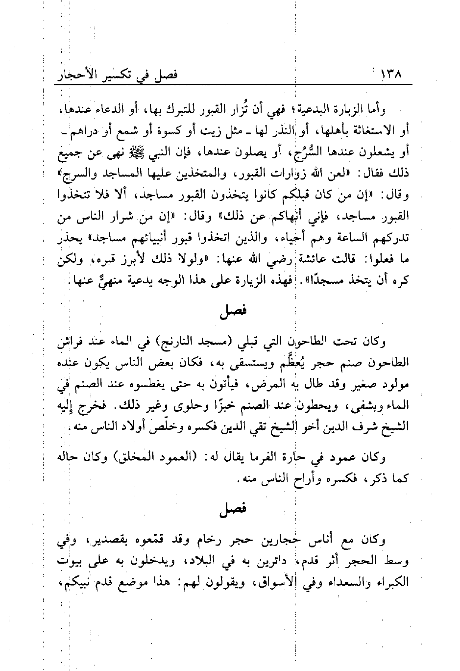 وكان تحت الطاحون التي قبلي (مسجد النارنج) في الماء عند فراش الطاحون صنم حجر يُعظَّم ويستسقى به، فكان بعض الناس يكون عنده مولود صغير وقد طال به المرض، فيأتون به حتى يغطسوه عند الصنم في الماء ويشفى، ويحطون عند الصنم خبزًا وحلوى وغير ذلك. فخرج إِليه الشيخ شرف الدين أخو الشيخ تقي الدين فكسره وخلّص أولاد الناس منه.