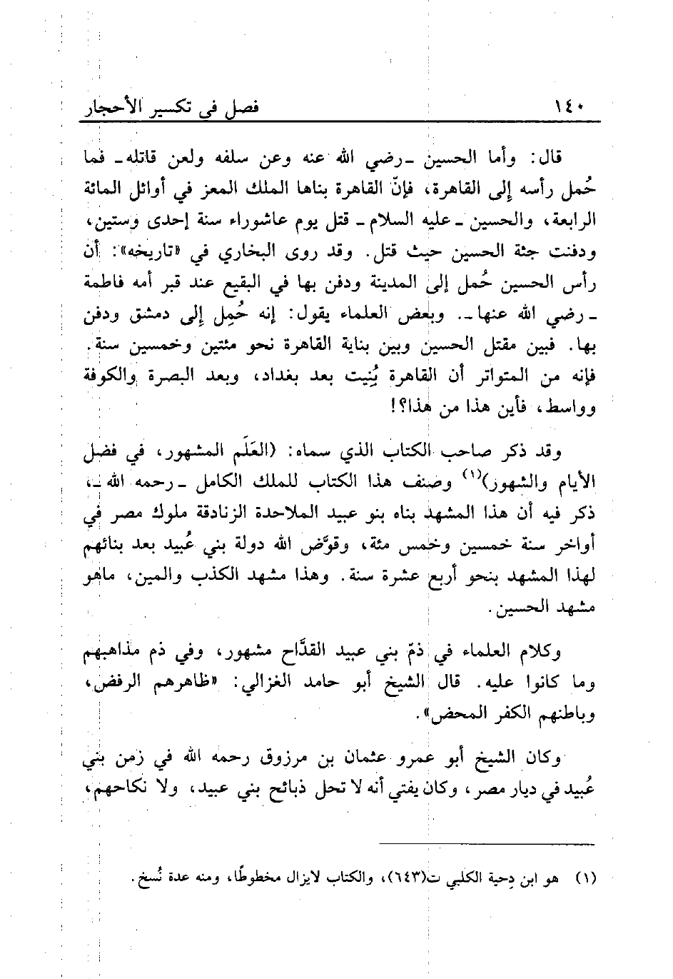 قال: وأما الحسين - رضي الله عنه وعن سلفه ولعن قاتله - فما حُمل رأسه إِلى القاهرة، فإنّ القاهرة بناها الملك المعز في أوائل المائة الرابعة، والحسين - عليه السلام - قتل يوم عاشوراء سنة إحدى وستين، ودفنت جثة الحسين حيث قتل. وقد روى البخاري في «تاريخه»: أن رأس الحسين حُمل إلى المدينة ودفن بها في البقيع عند قبر أمه فاطمة - رضي الله عنها -. وبعض العلماء يقول: إنه حُمِل إِلى دمشق ودفن بها. فبين مقتل الحسين وبين بناية القاهرة نحو مئتين وخمسين سنة. فإنه من المتواتر أن القاهرة بُنِيت بعد بغداد، وبعد البصرة والكوفة وواسط، فأين هذا من هذا؟!