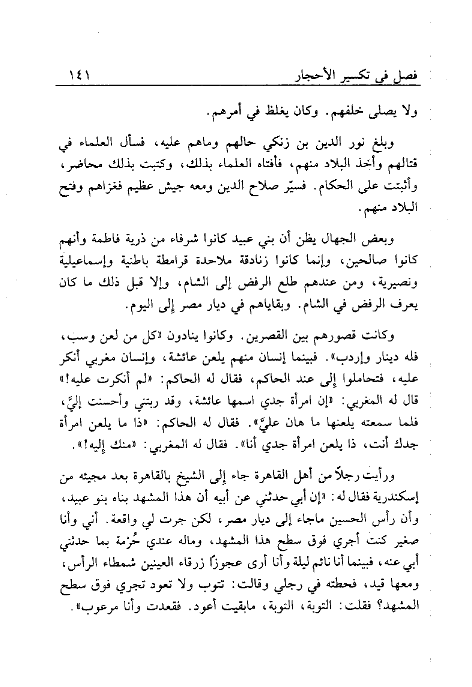 وبعض الجهال يظن أن بني عبيد كانوا شرفاء من ذرية فاطمة وأنهم كانوا صالحين، وإنما كانوا زنادقة ملاحدة قرامطة باطنية وإسماعيلية ونصيرية، ومن عندهم طلع الرفض إلى الشام، وإلا قبل ذلك ما كان يعرف الرفض في الشام. وبقاياهم في ديار مصر إِلى اليوم.