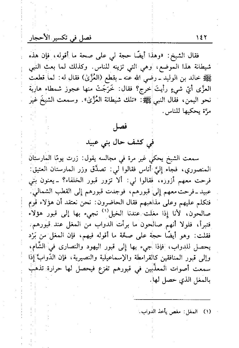 سمعت الشيخ يحكي غير مرة في مجالسه يقول: زرت يومًا المارستان المنصوري، فجاء إِليِّ أناس فقالوا لي: تصدَّق وزر المارستان العتيق: فرحت معهم أزوره، فقالوا لي: ألا تزور قبور الخلفاء؟ - يعنون بين عبيد - فرحت معهم إِلى قبورهم، فوجدت قبورهم إِلى القطب الشمالي. فتكلم عليهم وعلى مذاهبهم فقال الحاضرون: نحن نعتقد أن هؤلاء قوم صالحون، لأنا إذا مغلت عندنا الخيل (¬1) نجيء بها إلى قبور هؤلاء فتبرأ، فلولا أنهم صالحون ما برأت الدواب من المغل عند قبورهم. فقلت: وهو أيضًا حجة على صحَّة ما أقوله فيهم، فإن المغل من بَرْد يحصل للدواب، فإذا جيء بها إِلى قبور اليهود والنصارى في الشَّام، وإلى قبور المنافقين كالقرامطة والإسماعيلية والنصيرية، فإن الدّوابَّ إِذا سمعت أصوات المعذَّبين في قبورهم تفزع فيحصل لها حرارة تذهب بالمغل الذي حصل لها.