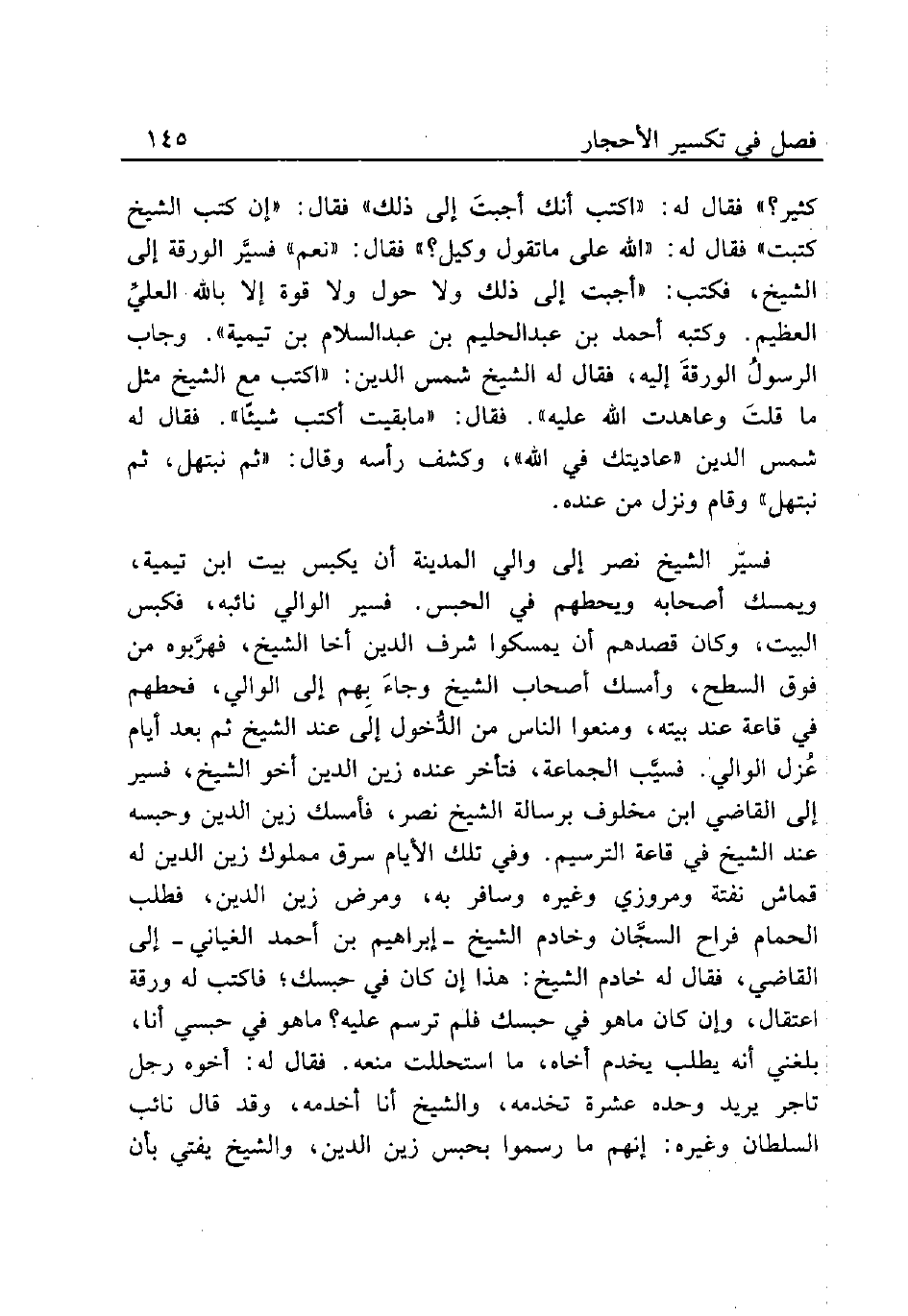 فسيّر الشيخ نصر إلى والي المدينة أن يكبس بيت ابن تيمية، ويمسك أصحابه ويحطهم في الحبس. فسير الوالي نائبه، فكبس البيت، وكان قصدهم أن يمسكوا شرف الدين أخا الشيخ، فهرَّبوه من فوق السطح، وأمسك أصحاب الشيخ وجاءَ بِهم إلى الوالي، فحطهم في قاعة عند بيته، ومنعوا الناس من الدُّخول إلى عند الشيخ ثم بعد أيام عُزل الوالي. فسيَّب الجماعة، فتأخر عنده زين الدين أخو الشيخ، فسير إلى القاضي ابن مخلوف برسالة الشيخ نصر، فإمسك زين الدين وحبسه عند الشيخ في قاعة الترسيم. وفي تلك الأيام سرق مملوك زين الدين له قماش نفتة مروزي وغيره وسافر به، ومرض زين الدين، فطلب الحمام فراح السجَّان وخادم الشيخ - إبراهيم بن أحمد الغياني - إلى القاضي، فقال له خادم الشيخ: هذا إن كان في حبسك؛ فاكتب له ورقة اعتقال، وإن كان ماهو في حبسك فلم ترسم عليه؟ ماهو في حبسي أنا، بلغني أنه يطلب يخدم أخاه، ما استحللت منعه. فقال له: أخوه رجل تاجر يريد وحده عشرة تخدمه، والشيخ أنا أخدمه، وقد قال نائب السلطان وغيره: إنهم ما رسموا بحبس زين الدين، والشيخ يفتي بأن