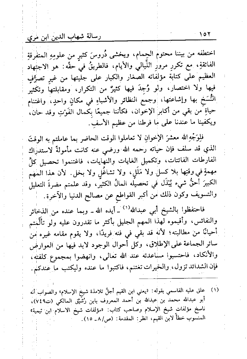 (¬1) علق عليه القاسمي بقوله: "يعني ابن القيم أجلَّ تلامذة شيخ الإسلام" والصواب أنه أبو عبد الله محمد بن عبد الله بن أحمد المعروف بابن رُشَيق المالكي (ت 749)، ناسخ مؤلفات شيخ الإسلام وصاحب كتاب: "مؤلفات شيخ الإسلام ابن تيمية" المنسوب خطأ لابن القيم، انظر: المقدمة: (ص/ 8 - 15).