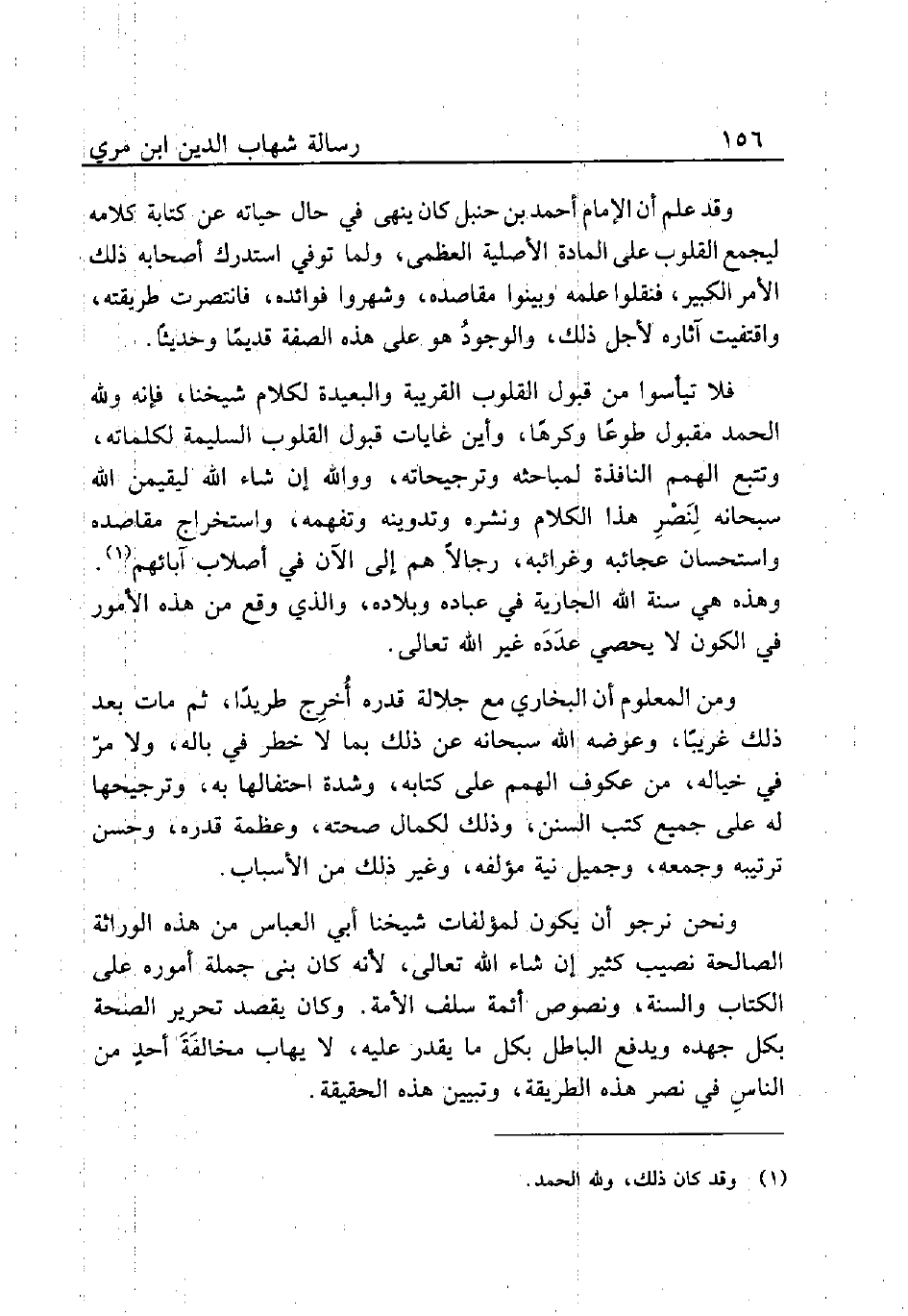 وقد علم أن الإمام أحمد بن حنبل كان ينهى في حال حياته عن كتابة كلامه ليجمع القلوب على المادة الأصلية العظمى، ولما توفي استدرك أصحابه ذلك الأمر الكبير، فنقلوا علمه وبينوا مقاصده، وشهروا فوائده، فانتصرت طريقته، واقتفيت آثاره لأجل ذلك، والوجودُ هو على هذه الصفة قديمًا وحديثًا.