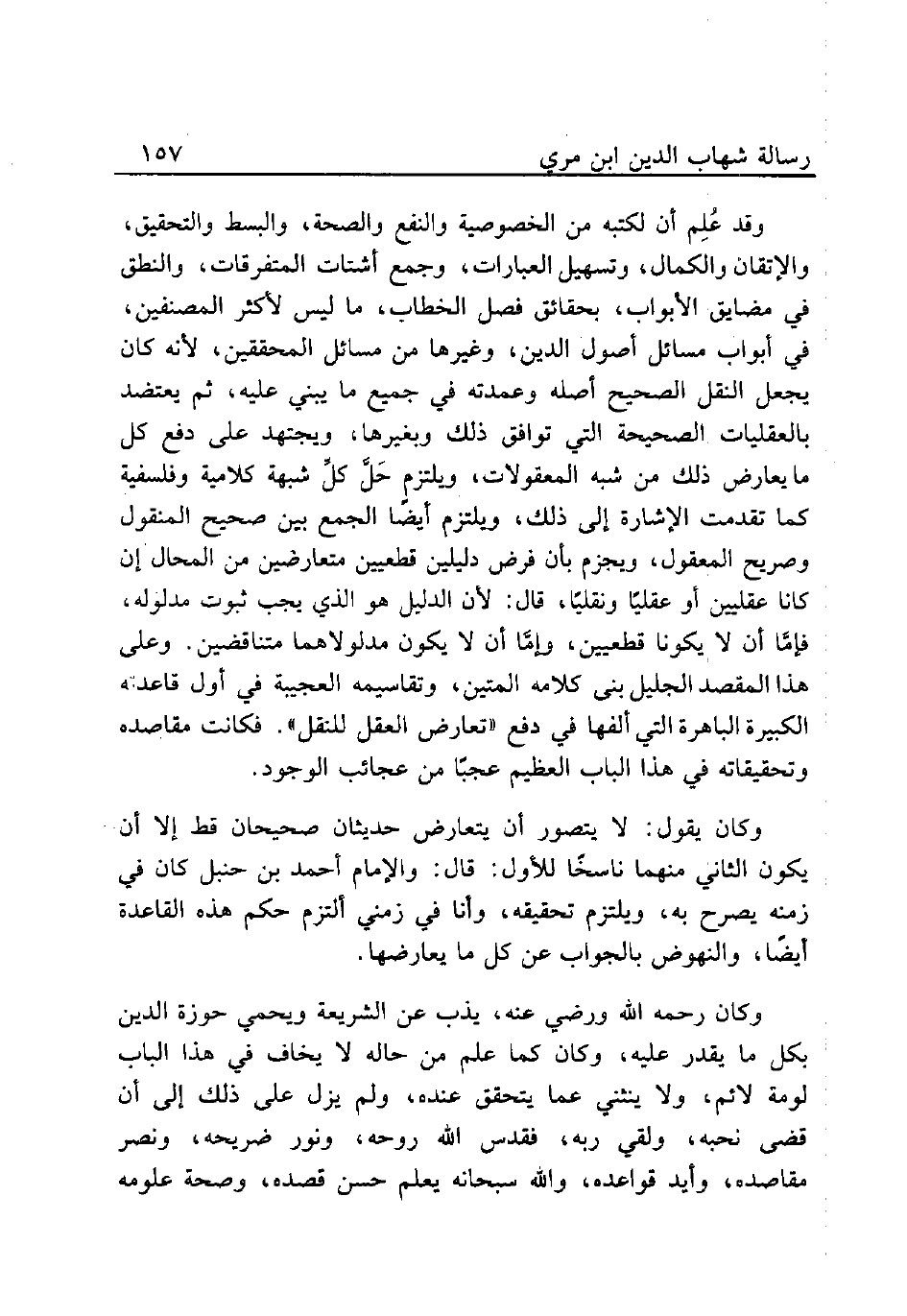 وقد عُلِم أن لكتبه من الخصوصية والنفع والصحة، والبسط والتحقيق، والإتقان والكمال، وتسهيل العبارات، وجمع أشتات المتفرقات، والنطق في مضايق الأبواب، بحقائق فصل الخطاب، ما ليس لأكثر المصنفين، في أبواب مسائل أصول الدين، وغيرها من مسائل المحققين، لأنه كان يجعل النقل الصحيح أصله وعمدته في جميع ما يبني عليه، ثم يعتضد بالعقليات الصحيحة التي توافق ذلك بغيها، ويجتهد على دفع كل ما يعارض ذلك من شبه المعقولات، ويلتزم حَلَّ كلِّ شبهة كلامية وفلسفية كما تقدمت الإشارة إلى ذلك، ويلتزم أيضًا الجمع بين صحيح المنقول وصريح المعقول، ويجزم بأن فرض دليلين قطعيين متعارضين من المحال إن كانا عقليين أو عقليًا ونقليًا، قال: لأن الدليل هو الذي يجب ثبوت مدلوله، فإمَّا أن لا يكونا قطعيين، وإمَّا أن لا يكون مدلولهما متناقضين. وعلى هذا المقصد الجليل بنى كلامه المتين، وتقاسيمه العجيبة في أول قاعدته الكبيرة الباهرة التي ألفها في دفع «تعارض العقل للنقل». فكانت مقاصده وتحقيقاته في هذا الباب العظيم عجبًا من عجائب الوجود.
