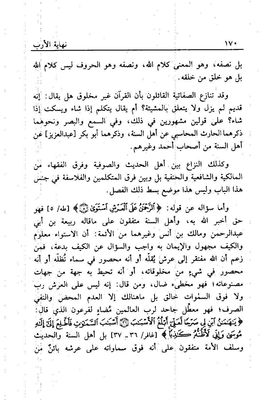 وأما سؤاله عن قوله: {الرَّحْمَنُ عَلَى الْعَرْشِ اسْتَوَى (5)} [طه/ 5] فهو حق أخبر الله به، وأهل السنة متفقون على ماقاله ربيعة بن أبي عبد الرحمن ومالك بن أنس وغيرهما من الأئمة: أن الاستواء معلوم والكيف مجهول والإيمان به واجب والسؤال عن الكيف بدعة، فمن زعم أن الله مفتقر إلى عرش يُقلّه أو أنه محصور في سماء تُظلّه أو أنه محصور في شيءٍ من مخلوقاته، أو أنه تحيط به جهة من جهات مصنوعاته؛ فهو مخطئ ضال، ومن قال: إنه ليس على العرش رب ولا فوق السموات خالق بل ماهنالك إلا العدم المحض والنفي الصرف؛ فهو معطِّل جاحد لرب العالمين مُضاهٍ لفرعون الذي قال: {يَا هَامَانُ ابْنِ لِي صَرْحًا لَعَلِّي أَبْلُغُ الْأَسْبَابَ (36) أَسْبَابَ السَّمَاوَاتِ فَأَطَّلِعَ إِلَى إِلَهِ مُوسَى وَإِنِّي لَأَظُنُّهُ كَاذِبًا} [غافر/ 36 - 37] بل أهل السنة والحديث وسلف الأمة متفقون على أنه فوق سماواته على عرشه بائنٌ من