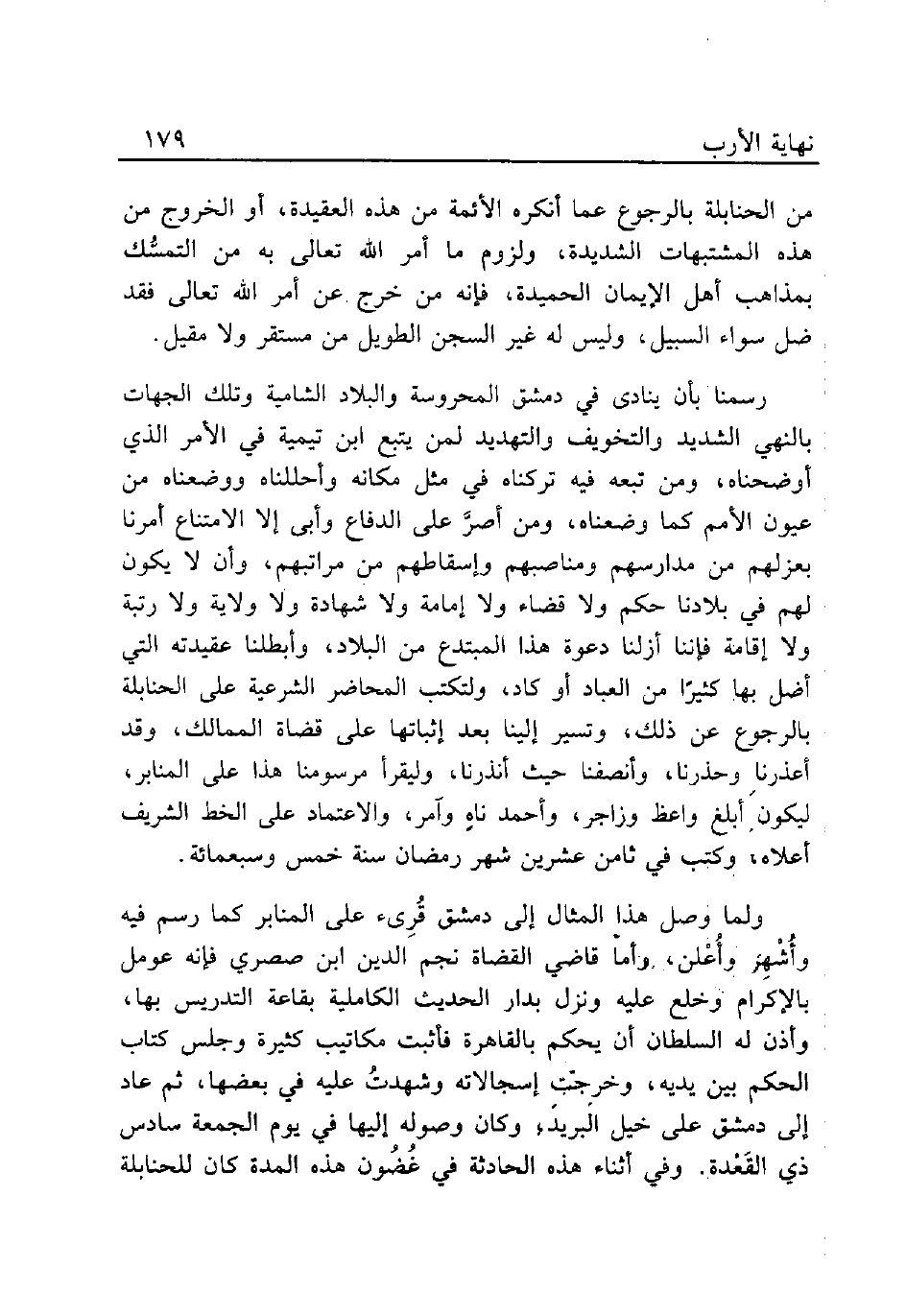 رسمنا بأن ينادى في دمشق المحروسة والبلاد الشامية وتلك الجهات بالنهي الشديد والتخويف والتهديد لمن يتبع ابن تيمية في الأمر الذي أوضحناه، ومن تبعه فيه تركناه في مثل مكانه وأحللناه ووضعناه من عيون الأمم كما وضعناه، ومن أصرَّ على الدفاع وأبى إلا الامتناع أمرنا بعزلهم من مدارسهم ومناصبهم وإسقاطهم من مراتبهم، وأن لا يكون لهم في بلادنا حكم ولا قضاء ولا إمامة ولا شهادة ولا ولاية ولا رتبة ولا إقامة فإننا أزلنا دعوة هذا المبتدع من البلاد، وأبطلنا عقيدته التي أضل بها كثيرًا من العباد أو كاد، ولتكتب المحاضر الشرعية على الحنابلة بالرجوع عن ذلك، وتسير إلينا بعد إثباتها على قضاة الممالك، وقد أعذرنا وحذرنا، وأنصفنا حيث أنذرنا، وليقرأ مرسومنا هذا على المنابر، ليكون أبلغ واعظ وزاجر، وأحمد ناهٍ وآمر، والاعتماد على الخط الشريف أعلاه، وكتب في ثامن عشرين شهر رمضان سنة خمس وسبعمائة.