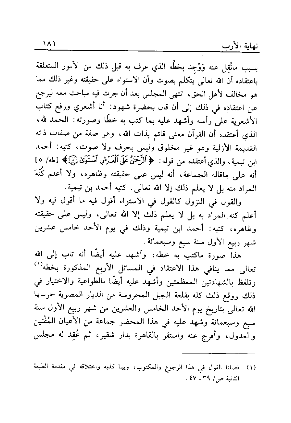بسبب ما نُقِل عنه وَوُجِد بخطُه الذي عرف به قبل ذلك من الأمور المتعلقة باعتقاده أن الله تعالى يتكلم بصوت وأن الاستواء على حقيقته وغير ذلك مما هو مخالف لأهل الحق، انتهى المجلس بعد أن جرت فيه مباحث معه ليرجع عن اعتقاده في ذلك إلى أن قال بحضور شهود: أنا أشعري ورفع كتاب الأشعرية على رأسه وأشهد عليه بما كتب به خطًا وصورته: الحمد لله، الذي أعتقده أن القرآن معنى قائم بذات الله، وهو صفة من صفات ذاته القديمة الأزلية وهو غير مخلوق وليس بحرف ولا صوت، كتبه: أحمد ابن تيمية، والذي اعتقده من قوله: {الرَّحْمَنُ عَلَى الْعَرْشِ اسْتَوَى (5)} [طه/ 5] أنه على ما قاله الجماعة، أنه ليس على حقيقته وظاهره، ولا أعلم كُنْهَ المراد منه بل لا يعلم ذلك إلا الله تعالى. كتبه احمد بن تيمية.